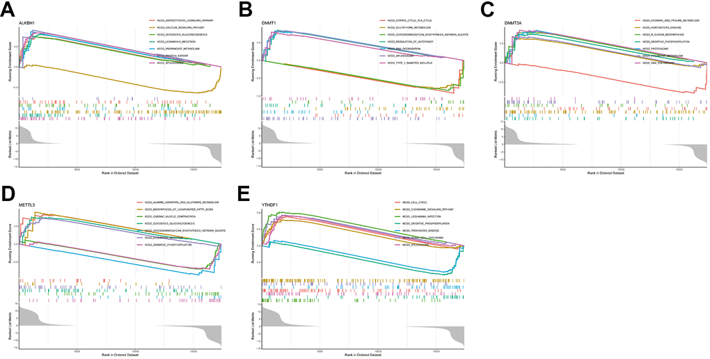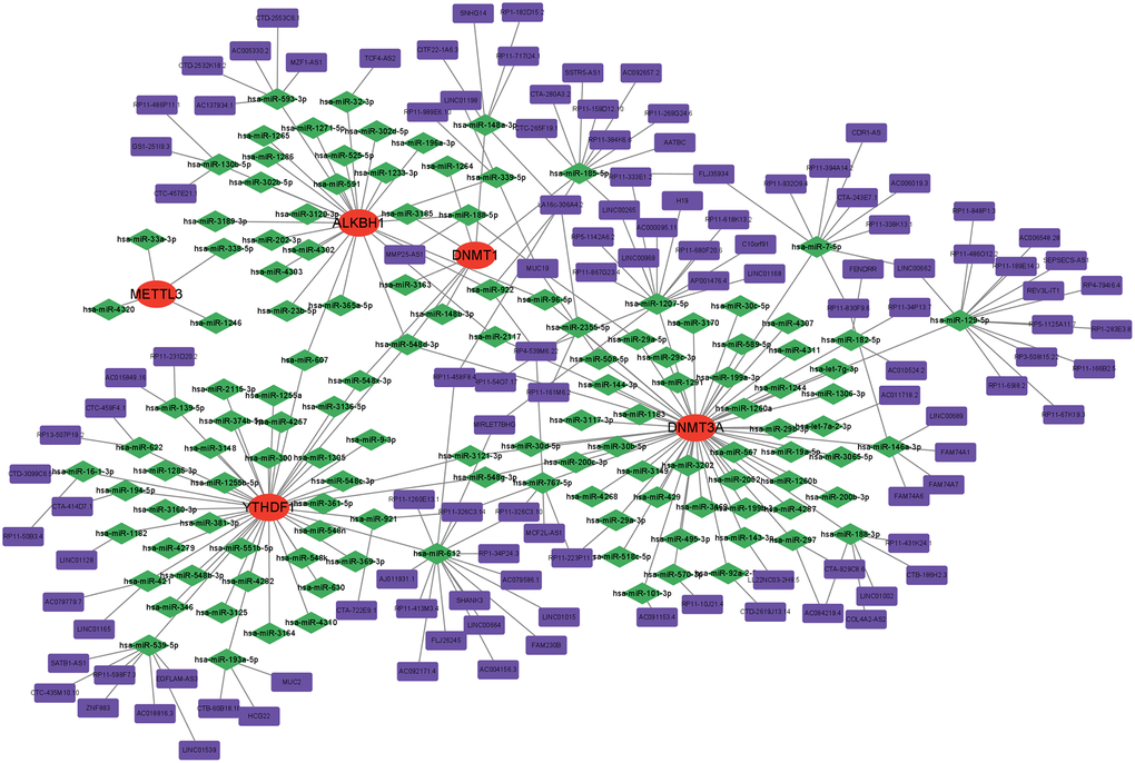 Finally, based on the multiple machine learning algorithm, four diagnostic models were constructed by using DEGs. Among these models, the SVM model displayed the highest predictive efficacy in the training cohort. Subsequently, five variables (YTHDF1, METTL3, DNMT1, DNMT3A, and ALKBH1) were selected as the predicted genes. Combining with the calibration curves of the nomogram, a robust concordance was observed between the predicted and actual observed values. Pathway-related single-gene GSEA further confirmed the involvement of hub genes in the immune microenvironment. Simultaneously, a gene-drug regulatory network was predicted and constructed as per the hub genes, offering a theoretical foundation for the development of targeted immunotherapy for AD. Taking into account the potential regulatory roles of miRNAs and lncRNAs on mRNAs, a ceRNA network was established by using hub genes, enhancing our comprehension of its molecular regulatory mechanism. In addition, drugs may also influence hub gene expression through regulatory RNA interactions, and if there are researchers engaged in in-depth drug development, these two charts deserve reference.