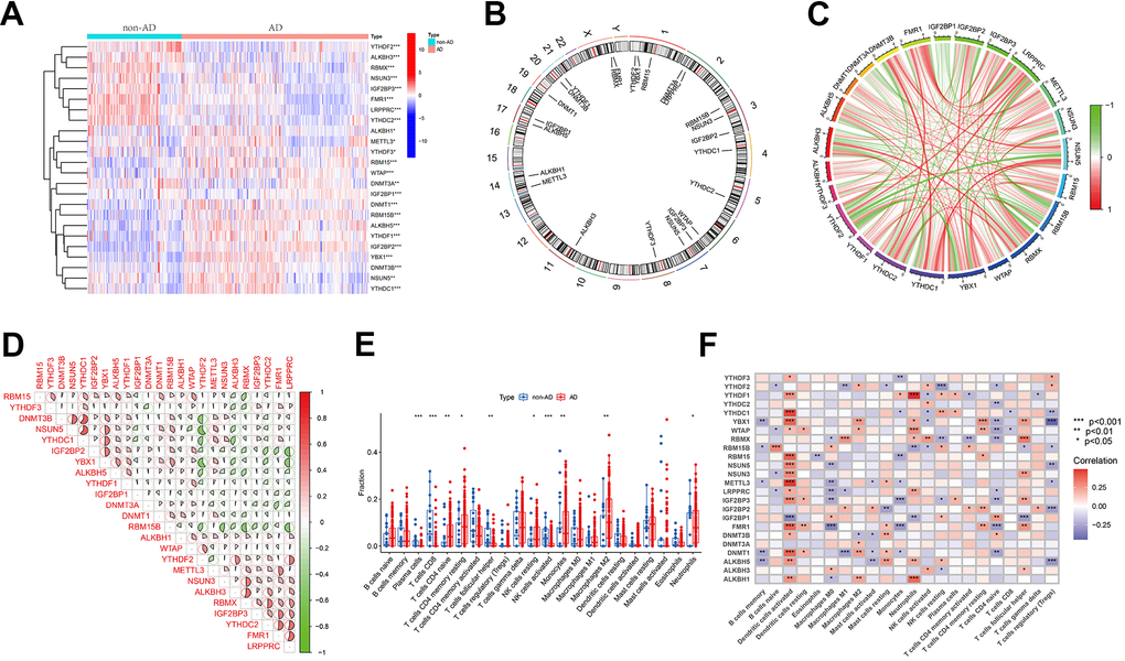 Figure 1 depicts a comprehensive flow chart outlining the research route of this study. In the exploration of the biological significance of methylation regulators in AD, the GSE33000 dataset was employed for examining the expression profiles of 50 genes associated with three methylation modification gene sets. A total of 24 genes exhibited differential expression, with 15 (ALKBL1, ALKBL5, DNMT1, DNMT3B, IGF2BP1, IGF2BP2, METTL3, NSUN5, RBM15, RBM15B, WTAP, YBX1, YTHDC1, THDF 1 and THDF 3) exhibiting upregulation in individuals with AD, and 9 (ALKBL3, DNMT3A, FMR1, IGF2BP3, LRPPRC, NSUN3, RBMX, YTHDC2 and THDF 2) exhibiting downregulation compared to non-AD patients (Figure 2A). The locations of the 24 regulators on the chromosome were depicted in Figure 2B using the ‘RCircos’ package. Following this, correlation studies were conducted on DEGs to investigate the potential involvement of methylation regulators in AD development. Surprisingly, certain methylation regulators, such as YTHDC1 and DNMT3B, along with YTHDC1 and NSUN 5, showed strong synergies. Meanwhile, YTHDF2 and NSUN5, along with YTHDF2 and YBX 1, showed a competing relationship (Figure 2C, 2D).