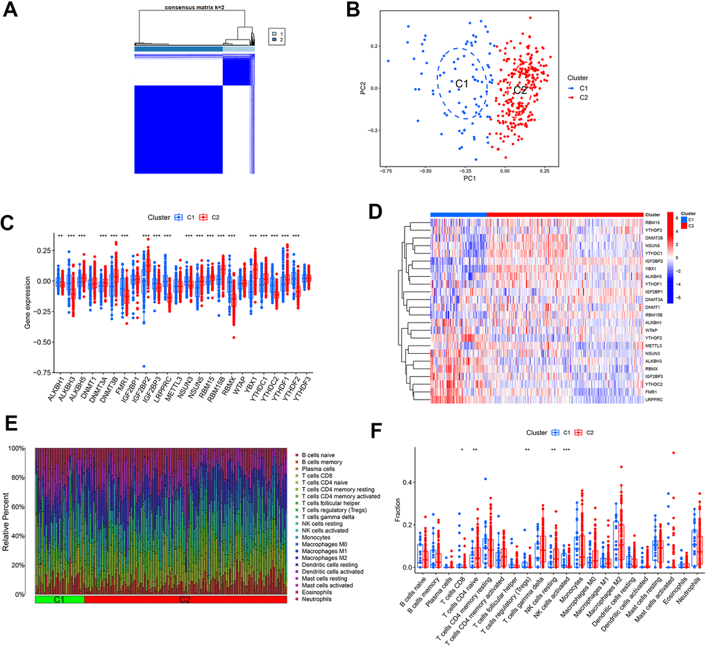 To investigate the impact of methylation modification regulators in AD, a consensus cluster analysis was performed to examine potential novel molecular subtypes among individuals with AD. So, 310 AD samples were classified into 2 clusters according to the expression profiles of 24 regulatory factors, setting k = 2 yielded the most consistent cluster values (Figure 3A), and the PCA revealed different transcription rates between the two clusters (Figure 3B). Moreover, cluster 1 showed elevated expression levels of ALKBH1, ALKBH3, FMR1, IGF2BP3, LRPPRC, NSUN3, RBMX, YTHDC2, and YTHDF2 genes, whereas cluster 2 exhibited elevated expression levels of ALKBH5, DNMT3A, DNMT3B, IGF2BP2, NSUN5, RBM15, RBM15B, YBX1, YTHDC1, and YTHDF1 genes (Figure 3C, 3D). Immune infiltration analysis further demonstrated variations in the immune microenvironment between the two clusters (Figure 3E). Cluster 1 displayed a higher prevalence of CD8+ T cells, regulatory T cells, and activated NK cells, whereas cluster 2 displayed a higher prevalence of naive CD4+ T cells and resting NK cells (Figure 3F).