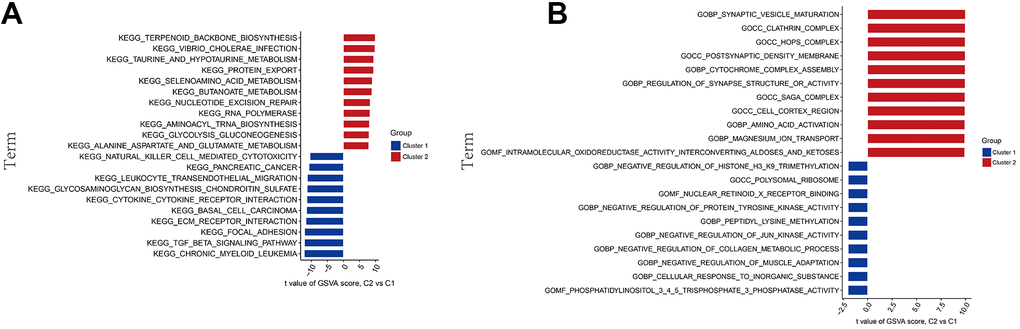 To delve deeper into the functional differences between the two groups of methylation modification gene clusters, GSVA was employed. The findings demonstrated that cluster 1 exhibited heightened natural killer cell-mediated cytotoxicity, cytokine-cytokine receptor interaction and TGF-β signaling pathway. Conversely, cluster 2 demonstrated activation of pathways related to terpenoid skeleton biosynthesis, vibrio cholerae infection, and metabolism (Figure 4A). Moreover, functional enrichment analysis highlighted that cluster 1 was related to protein tyrosine kinase activity and negative regulation of JUN kinase, and cluster 2 was associated with the mature development of synapses, regulation of cytochrome complex assembly, and amino acid activation (Figure 4B).