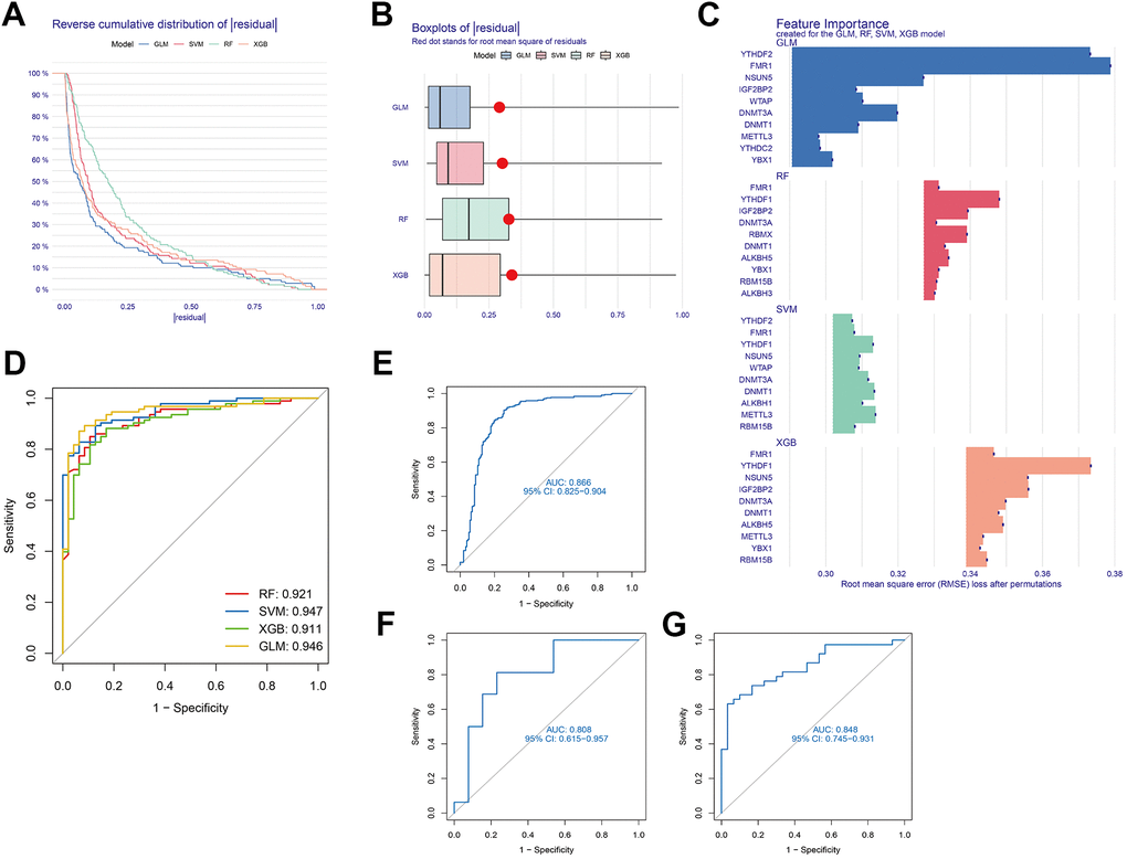 For exploring the link between methylation regulators and AD subtypes, four machine learning models—GLM, RF, SVM, and XGB—were developed using the 24 DEGs in the AD training set. The objective was to identify genes specific with high diagnostic value. The interpretation of these four models and visualisation of the residual distribution for every model in the test set were accomplished by the R “DALEX” package. Notably, the GLM and SVM models exhibited lower residuals (Figure 5A, 5B). Subsequently, ten key genes were identified from the four modules, ranked based on root mean square error (RMSE) (Figure 5C). Additionally, the diagnostic efficacy of the four models was determined through the ROC curve. Notably, the SVM model demonstrated the highest diagnostic power (AUC = 0.947) (Figure 5D). Collectively, these findings highlight the superiority of the SVM model in distinguishing between patient groupings. Following the execution of the SVM model, the top five variables (YTHDF1, METTL3, DNMT 1, DNMT3A, ALKBH1) were chosen as predictor genes. The ROC analysis of the five genes based on the SVM model in the 3 GEO datasets (GSE33000, GSE122063, and GSE44770) was illustrated in Figure 5E–5G. Notably, the AUC values for all three GEO datasets exceeded 0.8, signifying that the model constructed by SVM possessed a high diagnostic value.