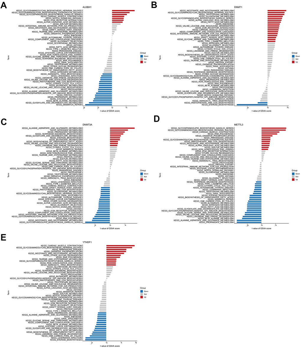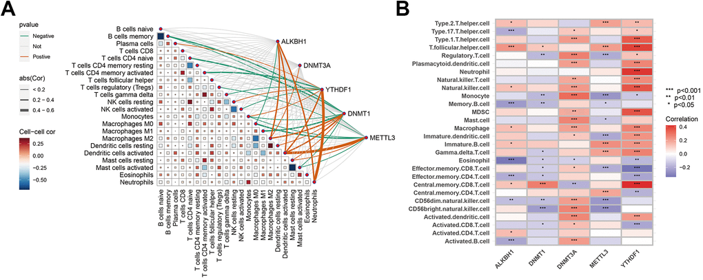 In exploring the association between hub genes and immune cells, various algorithms were employed for analysis. By using the CIBERSORT algorithm, it was observed that Macrophages M2 exhibited positive correlations with ALKBH1, DNMT1, and DNMT3A, whereas activated DC exhibited positive correlations with ALKBH1, DNMT1, METTL3, and YTHDF1. Neutrophils were positively correlated with ALKBH1 and YTHDF1. In addition, DNMT3A and YTHDF1 were significantly negatively correlated with other immune cells, encompassing monocytes, memory B cells, M0 Macrophages, M1 Macrophages, etc. Moreover, through ssGSEA, it was found that DNMT3A and YTHDF1 exhibited significant positive associations with the majority of immune cells, whereas DNMT1 and METTL3 exhibited negative correlations with a broader range of immune cells (Figure 6A, 6B). These results implied that the occurrence of AD may be associated with alterations in the immune microenvironment.