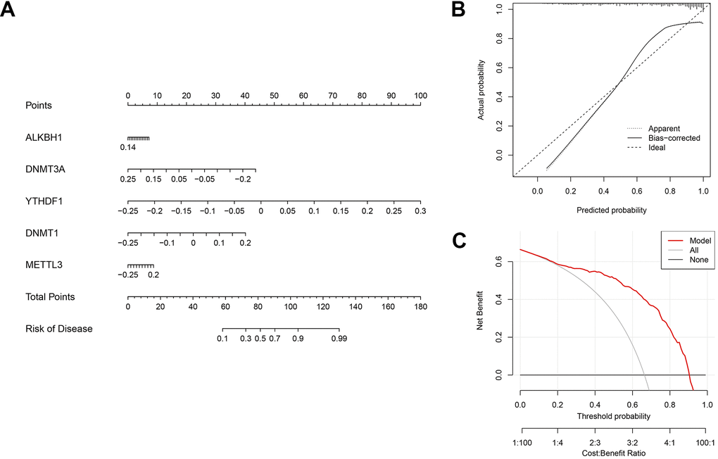 A nomogram was developed to evaluate the prognostic capability of the SVM model across diverse AD datasets (Figure 9A). Within the nomogram, each gene corresponded to a specific scoring criterion, and the cumulative scoring of all genes then predicted the risk of AD progression. The calibration curve of the nomogram exhibited a robust predictive performance (Figure 9B). Furthermore, the decision curve (Figure 9C) analysis revealed that the nomogram provided higher clinical benefit for patients through a comprehensive score of five methylation-related genes.