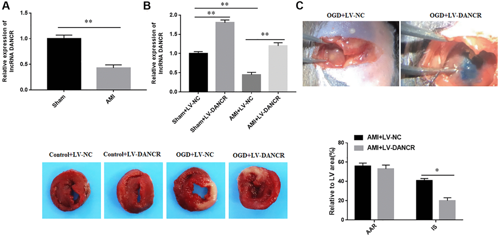 The results of RT-qPCR assay showed that expression of DANCR was significantly downregulated in the infarcted myocardium of AMI mice (Figure 1A). Next, LV-DANCR was injected into mice, and it was found that DANCR was successfully overexpressed in both AMI mice and normal mice (Figure 1B). Moreover, the effects of DANCR overexpression on the infarct size (IS) and the areas at risk (AAR) of AMI mice were examined by using Evens blue and TTC staining. The results showed that overexpression of DANCR had not significantly changed the AAR in AMI mice, but significantly reduced IS in AMI mice (Figure 1C). These results indicated that overexpression of DANCR reduced IS in AMI mice.