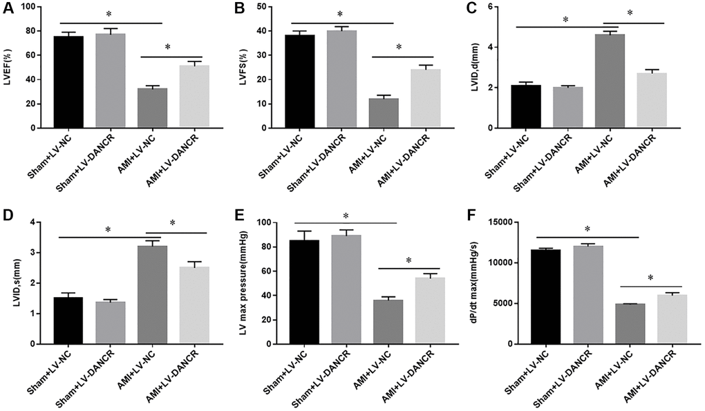 To explore the role of DANCR in AIM, the effects of DANCR overexpression on the recovery of cardiac dysfunction after AMI in mice was assessed. The results showed that left ventricular ejection fraction (LVEF), left ventricular fractional shortening (LVFS), left ventricular (LV) maximum pressure, and dP/dt maximum rate were significantly decreased, and diastolic and systolic left ventricular internal diameters (LVID,d and LVID,s) were markedly elevated in AMI mice. Overexpression of DANCR partially reversed the changes of these indicators in AMI mice, whereas this phenomenon was not observed in normal mice (Figure 2A–2F). These observations indicated that overexpression of DANCR improved the impaired cardiac contractile function in AMI mice.
