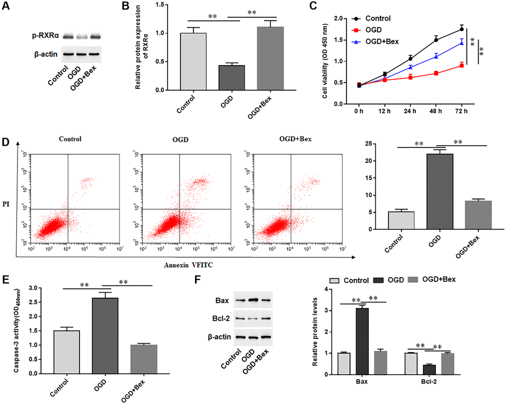 To investigate the role of RXRA on cardiomyocytes treated with OGD, we pretreated OGD-induced H9C2 cells with Bex, an activator of RXRA. OGD treatment markedly decreased the level of p-RXRA in H9C2 cells, while Bex treatment increased p-RXRA levels (Figure 5A, 5B). Furthermore, Bex significantly promoted cell proliferation, inhibited cell apoptosis, reduced Caspase-3 activity, decreased Bax protein levels, and increased Bcl-2 protein levels in OGD-treated H9C2 cells (Figure 5C–5F). The results demonstrated that p-RXRA promoted proliferation and inhibited apoptosis in cardiomyocytes induced by OGD.