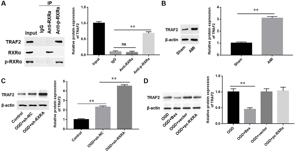 TRAF2 is a key regulator of cardiac function [29, 30]. Therefore, we speculated that the function of RXRA in cardiomyocytes may be associated with TRAF2. The results of Co-IP assay showed that phosphorylated RXRA protein was able to interact with TRAF2 protein, but the total RXRA protein could hardly bind to TRAF2 protein (Figure 6A). Moreover, we assessed TRAF2 expression levels in AMI mice and found that TRAF2 protein level was significantly upregulated in myocardium of AIM mice (Figure 6B). Meanwhile, we observed that silencing RXRA further promoted the protein expression of TRAF2 in OGD-induced H9C2 cells, while overexpression of RXRA had no effect on TRAF2 protein expression, which was inhibited by Bex, an RXRA phosphorylation activator (Figure 6C, 6D). These data suggested that phosphorylated RXRA inhibited TRAF2 protein expression by binding to TRAF2 protein.