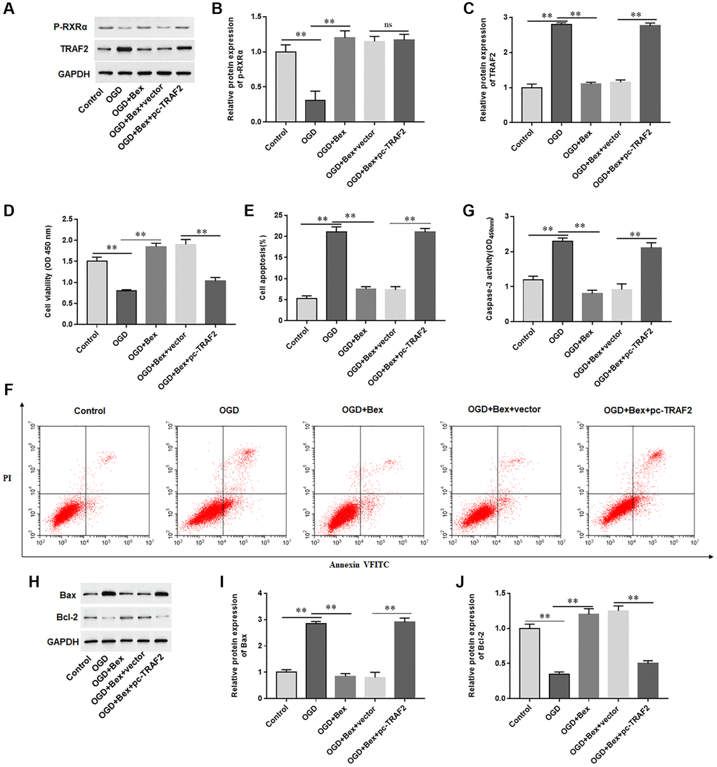 The results showed that Bex treatment increased p-RXRA levels and inhibited TRAF2 protein levels in OGD-treated H9C2 cells (Figure 7A–7C). Furthermore, we observed that Bex treatment markedly promoted proliferation, inhibited cell apoptosis and Caspase-3 activity, reduced Bax protein levels, and elevated Bcl-2 protein levels in OGD-induced H9C2 cells, while overexpression of TRAF2 markedly offset the protective effect of Bex on H9C2 cells, (Figure 7D–7J). The results demonstrated that p-RXRA reduced OGD-induced cardiomyocyte apoptosis through inhibiting TRAF2 upregulation.