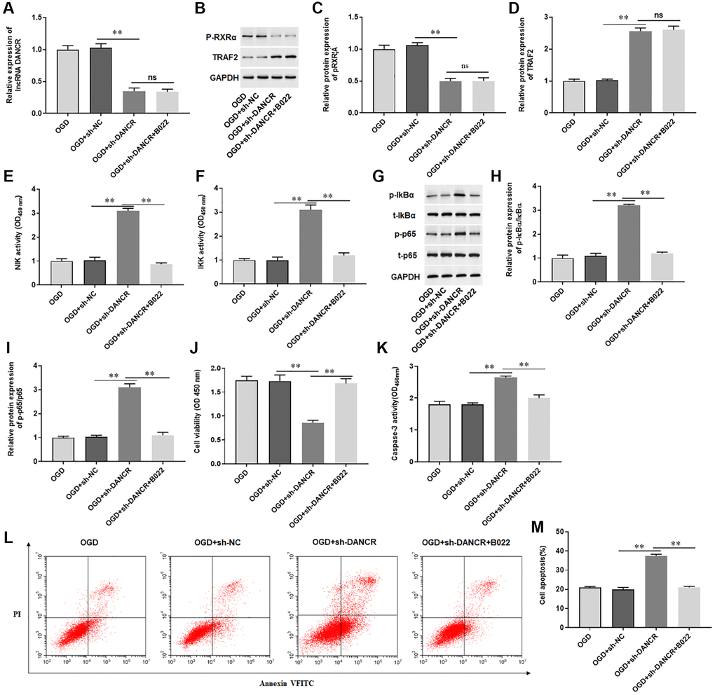 We sought to determine whether DANCR regulated apoptosis of cardiomyocytes through the NIK/IKK/NF-κB signaling pathway and found that silencing DANCR sensibly decreased the levels of DANCR, p-RXRA protein and increased TRAF2 protein in H9C2 cells treated with OGD (Figure 8A–8D). Furthermore, silencing DANCR markedly elevated the activity of NIK and IKK and increased the phosphorylation levels of IkBα and p65 in H9C2 cells treated with OGD, while B022, an inhibitor of NIK, inhibited the activity of NIK and IKK and phosphorylated protein expression of IkBα and p65 (Figure 8E–8I). Meanwhile, we also observed that silencing DANCR inhibited proliferation and promoted apoptosis of H9C2 cells treated with OGD, and silencing DANCR increased Caspase-3 activity in H9C2 cells treated with OGD (Figure 8J–8M). Whereas B022 treatment significantly offset the effects of DANCR silencing on H9C2 cells (Figure 8J–8M). The results demonstrated that silencing DANCR promoted OGD-induced cardiomyocyte apoptosis by activating the NIK/IKK/NF-κB pathway.