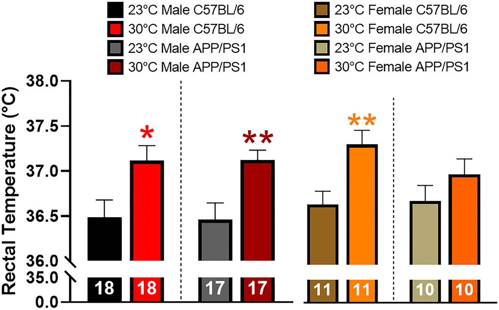 A separate cohort of male and female C57BL/6 and APP/PS1 mice were maintained at standard ambient temperature from birth until 11 months of age. A rodent thermometer with rectal probe (TK8851; BioSebLab) was used to obtain Tc when mice were 11 months old. These mice were then transferred to environmental chambers (Powers Scientific Cat: RIS33SD) maintained at 30°C until 12 months of age (1 month chronic treatment). Mice were transferred to a separate room within our animal facility maintained at 30°C to assess changes in Tc after one month of chronic exposure.