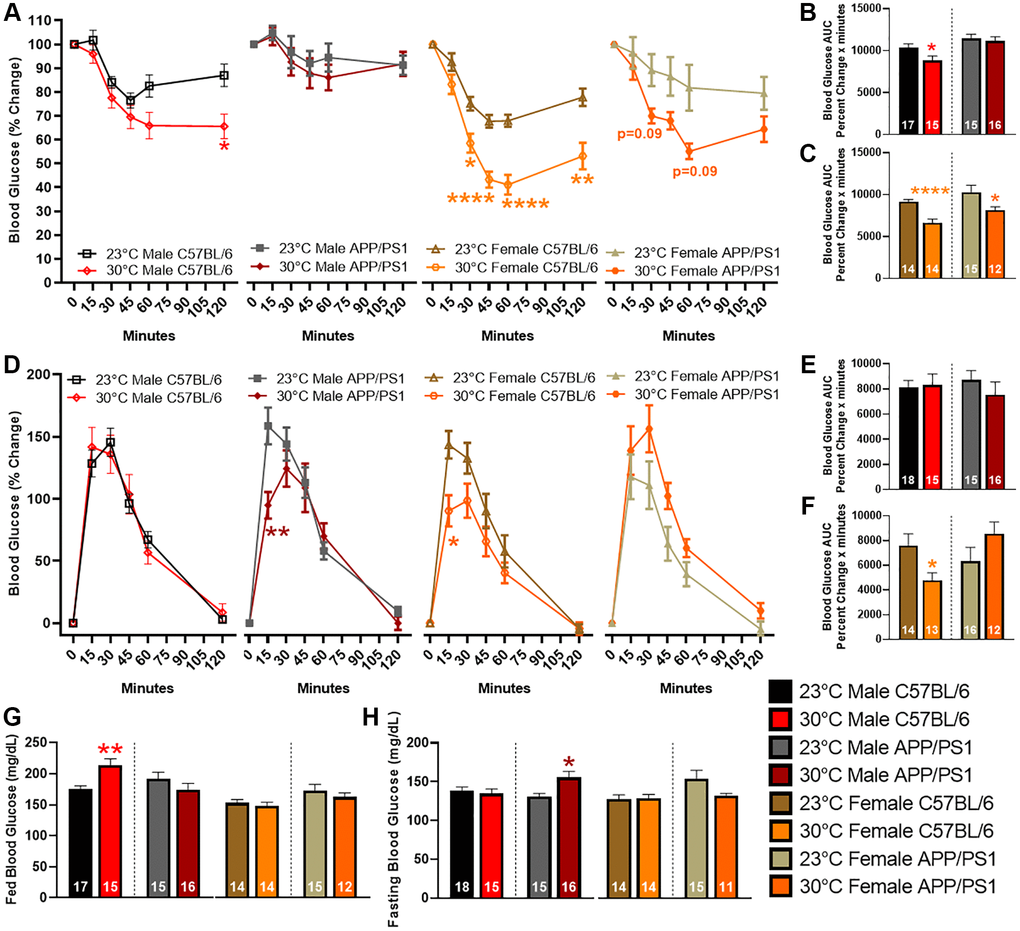 Repeated exposure (3–6 times per week) to thermotherapy for 30–60 minutes positively modulates insulin sensitivity and glucose tolerance in people with metabolic dysfunction [21, 22]. Previous research shows APP/PS1 mice have reduced insulin sensitivity and glucose tolerance compared with age-matched littermate controls [15, 20, 23]. To determine thermotherapeutic effects on blood glucose regulation, we performed an insulin and glucose tolerance tests (ITT and GTT, respectively) after six months of chronic thermotherapy treatment. During the ITT, an intraperitoneal (ip) injection of insulin decreased blood glucose levels to a greater extent in all groups receiving thermotherapy, except for male APP/PS1, when compared with genotype and sex-matched ambient temperature controls (Figure 2A). The ITT area under the curve (AUC) provides an overall indication of insulin sensitivity. Thermotherapy improved insulin sensitivity in all groups apart from male APP/PS1 mice (Figure 2B, 2C). The GTT provides an indication of the endogenous uptake of blood sugar into tissue for energy utilization or storage. Thermotherapy exposed male APP/PS1 and female C57BL/6 mice receiving thermotherapy had lower blood glucose levels 15 minutes after an ip injection of glucose than their corresponding ambient temperature controls (Figure 2D). No time point differences were observed in male C57BL/6 or female APP/PS1 mice. The GTT AUC provides an indication of overall glucose tolerance which was only improved in female C57BL/6 mice receiving thermotherapy (Figure 2E, 2F). Thermotherapy worsened fed blood glucose in male C57BL/6 (Figure 2G) and fasting blood glucose in male APP/PS1 mice (Figure 2H) despite their improved insulin sensitivity and glucose tolerance, respectively.