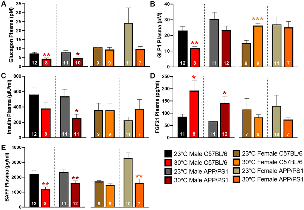 Circulating levels of plasma peptides and hormones that modulate blood glucose levels were measured by multiplex assays. Glucagon release from the pancreas promotes liver glycogenolysis thereby increasing circulating blood glucose levels. Chronic thermotherapy reduced plasma glucagon levels in all groups except female C57BL/6 mice (Figure 3A). Glucagon-like peptide 1 (GLP1) release from the gastrointestinal tract reduces circulating glucose levels by stimulating insulin release, suppressing glucagon secretion, and promoting satiety. Thermotherapeutic differences in plasma GLP1 levels were only observed in C57BL/6 mice with decreased levels in males and an increase observed in females (Figure 3B). Despite the changes observed in GLP1, thermotherapy did not affect plasma insulin in C57BL/6 mice, but a decrease was observed in male APP/PS1 mice (Figure 3C). Fibroblast growth factor 21 (FGF21) regulates metabolism and is important for thermogenic recruitment of white adipose tissue (WAT). Plasma FGF21 was elevated in male C57BL/6 and APP/PS1 mice housed at 30°C, but no differences were observed in females receiving thermotherapy (Figure 3D). B-cell activating factor (BAFF) is a member of the tumor necrosis factor (TNF) ligand family that regulates adipose tissue inflammation and impairment of insulin-receptor signaling [24]. Chronic thermotherapy treatment reduced plasma BAFF in both genotypes of male mice as well as female APP/PS1 mice, similar to plasma glucagon observations (Figure 3E). Taken together, these results show that six months of passive thermotherapy altered the plasma profile of peptides and hormones in a manner consistent with improved insulin sensitivity and glucose tolerance in a sex-dependent manner.