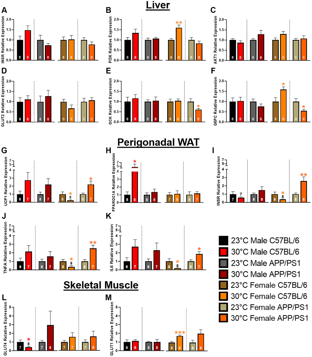 | Values represent mean ± SEM rounded to the nearest whole number, tenth, or hundredth. *p < 0.05, **p < 0.01, ***p < 0.001, ****p < 0.0001 indicate statistically significant differences from 23°C sex- and genotype-matched controls. Abbreviations: AUC: area under the curve; RE: relative expression. | |||||||||||||||||||||||||||||||||||||||||||||||||||||||||||||||||||||||||||||||||||||||||||||||||||