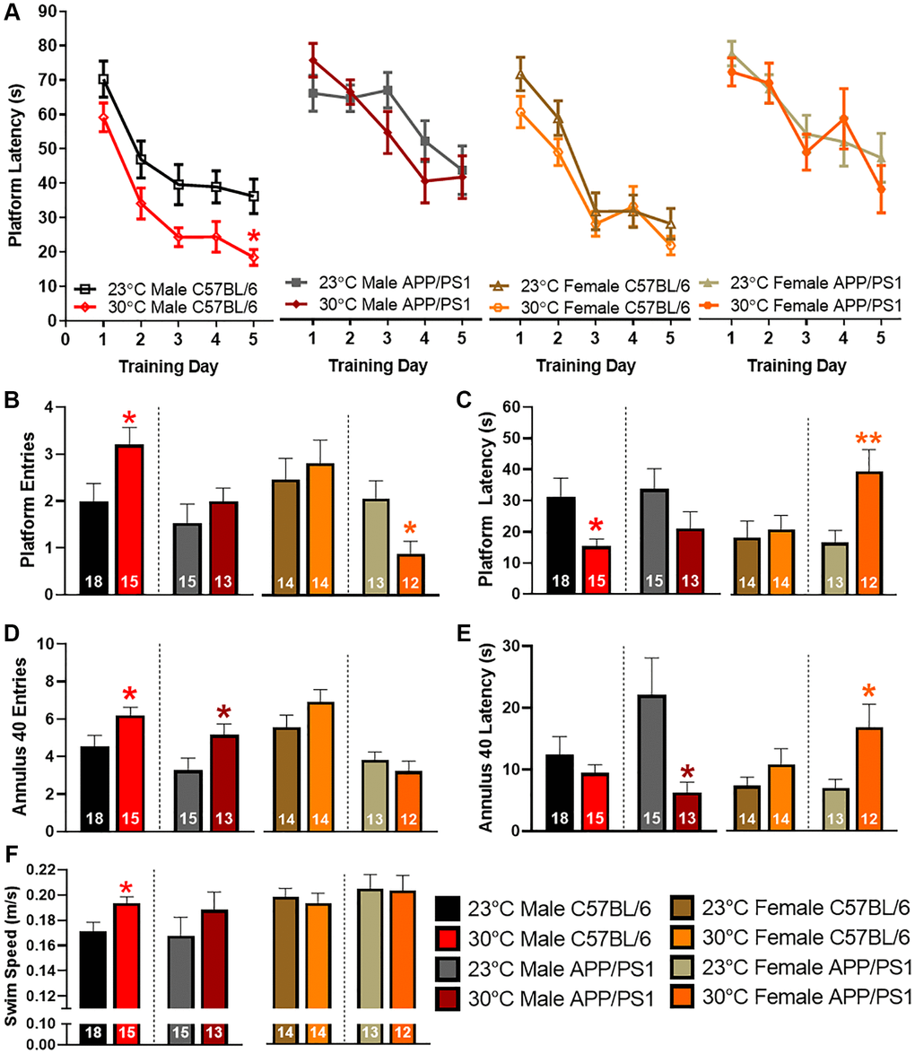 Spatial learning and memory recall is impaired in APP/PS1 mice by 12 months of age [15]. To determine if thermotherapy ameliorates these cognitive deficits, we tested mice using the Morris water maze (MWM) spatial navigation paradigm. During the training sessions, platform latency was decreased in male C57BL/6 mice exposed to 30°C (Figure 5A). All other groups had a similar learning profile. During the probe challenge, the number of platform entries (Figure 5B) were increased while latency to first platform entry (Figure 5C) was decreased in male C57BL/6 mice after thermotherapy. Female APP/PS1 mice exhibited a decrease in the number of platform entries and an increase in platform latency for first entry (Figure 5B, 5C). When examining an area slightly larger than the former location of the hidden escape platform, the number of annulus 40 entries (Figure 5D) were increased in both male C57BL/6 and APP/PS1 mice receiving thermotherapy. This also reduced the latency to first annulus 40 entry in male APP/PS1 mice (Figure 5E), but an increased latency in female APP/PS1 mice was observed. Thermotherapy increased the swimming speed in male C57BL/6 mice only (Figure 5F) that may be indicative of skeletal muscle enhancements due to the warmer environment [27]. This faster swimming along with an improved learning curve in male C57BL/6 mice accounts for their improved memory recall. However, in AD mice, these performance issues were not observed. Thermotherapy has sexually dimorphic cognitive effects regardless of AD genotype.