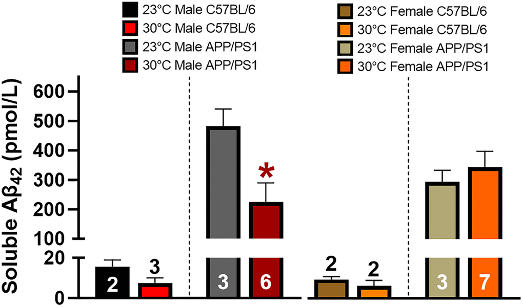 From 6 to 12 months of age, mouse cages were placed into an environmental chamber (Powers Scientific Cat: RIS33SD) maintained at 30 ± 1°C located within the same animal facility room. Mice were only removed from this chamber for cage cleanings. A separate cohort of age- and sex-matched C57BL/6 and APP/PS1 mice were maintained at a standard animal room ambient temperature (23 ± 1°C) and used as a within genotype temperature control.