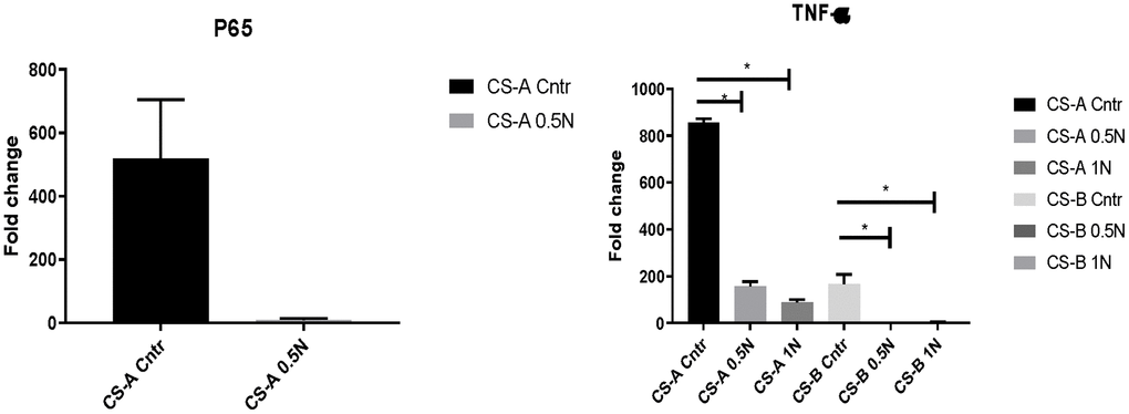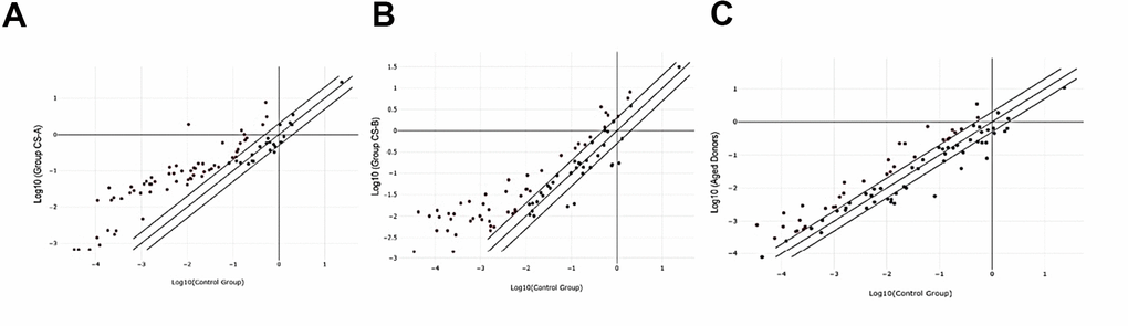 From the list of differentially expressed genes, statistical significance (P <0.05) was noted only in 5 genes in the CS-B group and in 6 genes in elderly donors’ group. Regarding the CS-A-affected individuals, no statistical significance was noted, however, the same trend was noted in gene expression in the CS-A and the elderly group. (Table 1).