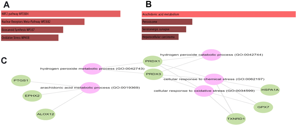 To estimate the functions of identified statistically significant genes, we further undergo gene set enrichment analysis (GSEA) using KEGG and wiki pathway. GSEA analysis showed that the selected set of genes was enriched in various biological processes, cellular components, and molecular functions. The subnetwork shows the following associations from Gene Ontology and from KEGG: GPX7, ALOX12, EPHX2, and PTGS1 belong to the biological process arachidonic acid metabolic process (GO:0019369) (adjusted P-value= 1.45e-05). While from WikiPathways: The genes PRDX1, NQO1, TXNRD1, and HSPA1A are members of the WikiPathway NRF2 pathway (WP2884) (adjusted P-value= 9.57e-04) (Figure 2A, 2B).
