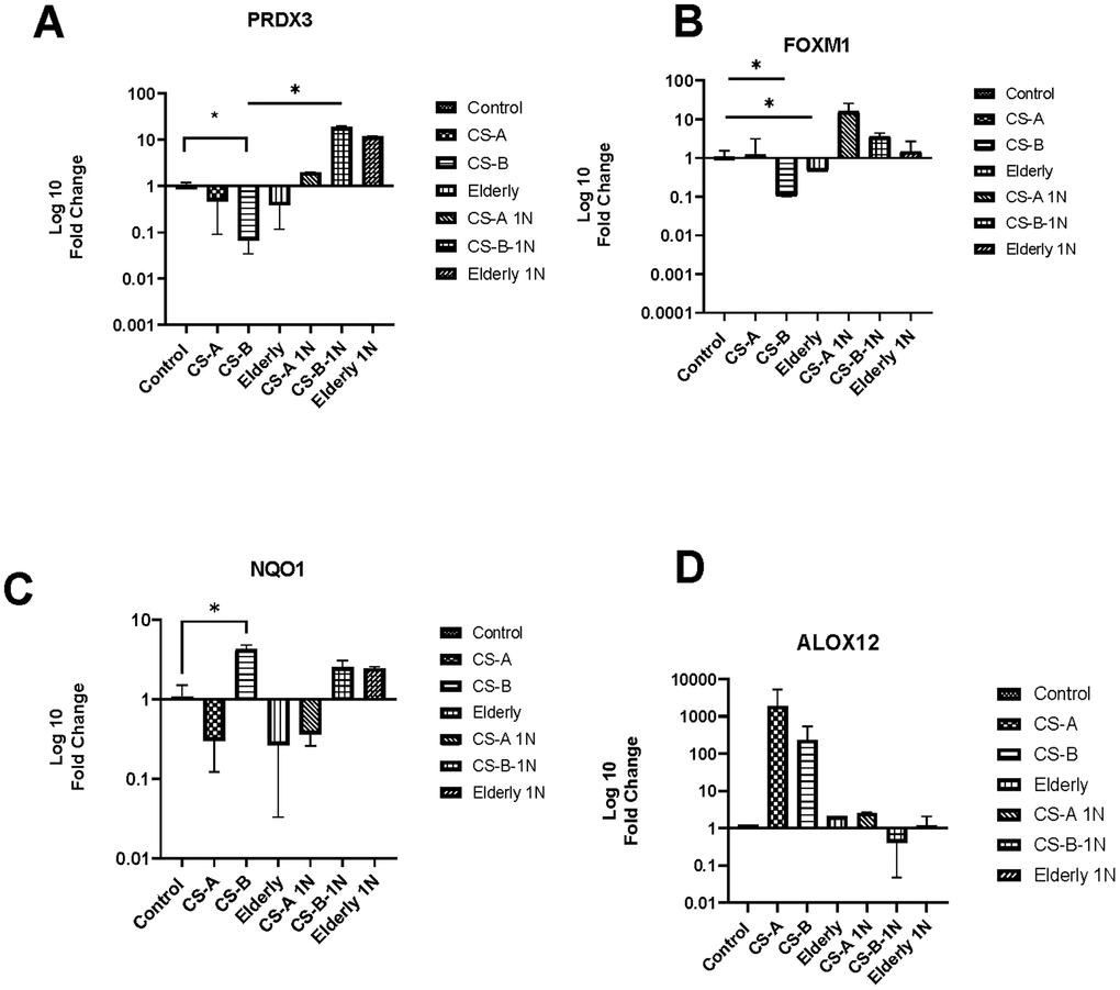 Table 1. Significantly altered oxidative stress gene expression in CS-A, CS-B and in elderly compared to young healthy control.