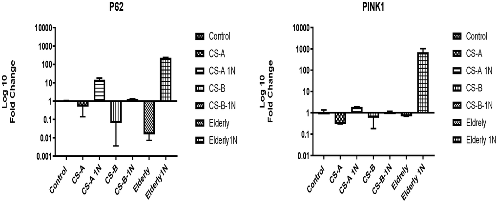 In CS affected individuals, the expression of both autophagy-related genes P62 and PINK1 was decreased in our cases which is consistent with previous work that showed that in response to stress, CS-B deficient cells demonstrated decreased colocalization of P62 and PINK1 within mitochondria resulting in decreased mitophagy. It is therefore important to note the beneficial role of NAM supplementation [49, 62].