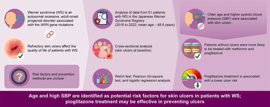 This study retrospectively investigated the background factors associated with skin ulcers in patients with WS. Patients with skin ulcers were significantly older and had higher SBP, while those without skin ulcers were significantly more likely to receive treatment with pioglitazone and metformin. Even after adjusting for age, treatment with pioglitazone remained significantly associated with a reduced risk of ulcers. These data suggest that pioglitazone treatment prevents the development of skin ulcers (Figure 1).
