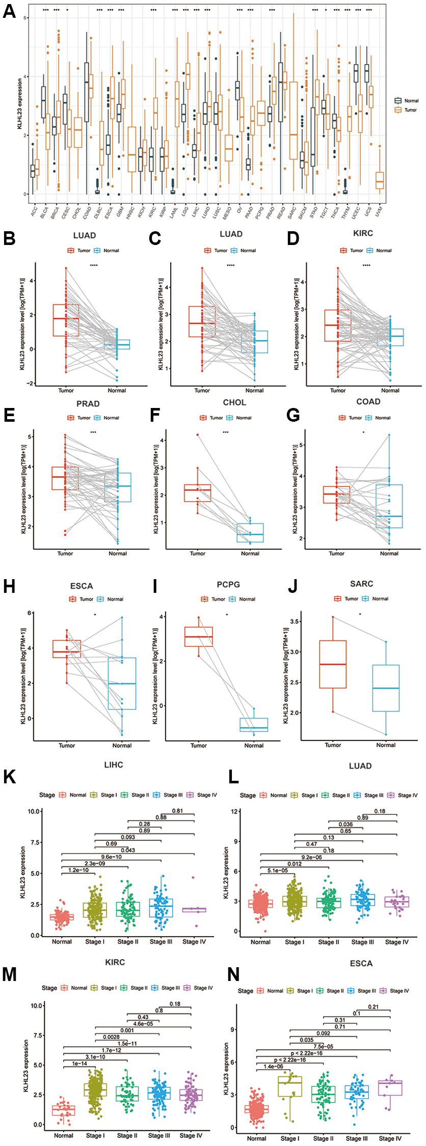 Additionally, we investigated the relationship between KLHL23 expression and cancer stage. Our findings indicated that KLHL23 expression levels were elevated in advanced stages of several cancers, including LIHC, LUAD, KIRC, and ESCA (Figure 1K–1N).