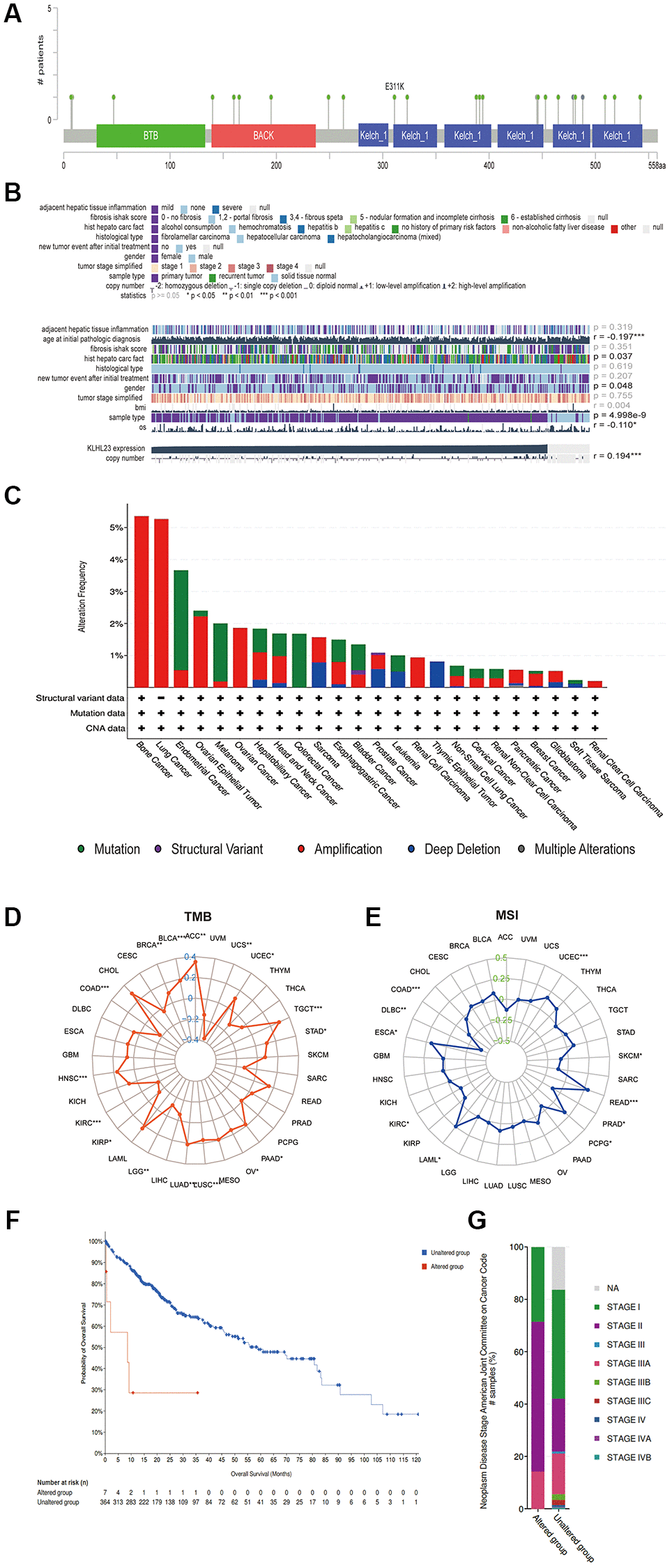 Somatic mutation and copy number variations (CNVs) are the two types of mutations that disrupt chromosomal stability and lead to oncogenic activation or tumor suppressor silencing, play a crucial role in driving tumorigenesis by altering gene dosage and expression patterns. Among these alterations, gene amplification is particularly notable, being most frequent in bone, lung, ovarian, and liver cancers (Figure 2C). Given the upregulated expression of KLHL23 in prevalent solid cancers, we decided to explore the correlation between KLHL23 mutations and expression in LIHC utilizing the Catalogue of Somatic Mutations in Cancer (COSMIC) database. Among the 418 LIHC cancer samples examined, the most prevalent genomic alteration was nucleotide mutation, followed by amplification and deletions. The KLHL23 protein exhibited mutations of E311K in the KELCH domain and T208A in the BTB and C-terminal Kelch (BACK) domain. Within LIHC cancer samples, T208A mutations were most frequently observed (Figure 2A, 2C). Liver cancer samples with mutation in KLHL23 showed higher cancer stage, and those patients had a worse prognosis (Figure 2F–G). Subsequently, we employed Gene Set Cancer Analysis (GSCA) to scrutinize whether a copy number variation (CNV) and DNA methylation in KLHL23 influenced its expression across 33 different cancer types. The results showed a positive association between CNV and KLHL23 expression (Figure 2B). We then analyzed the expression level of KLHL23 with the average DNA methylation levels near promoter region, and the result showed the majority of methylation events were negatively correlated with KLHL23 expression (Figure 2B). Moreover, tumor mutational burden (TMB) and microsatellite instability (MSI) show negative correlation with KLHL23 expression levels in COAD, KIRC, and KIRP (Figure 2D–2G).