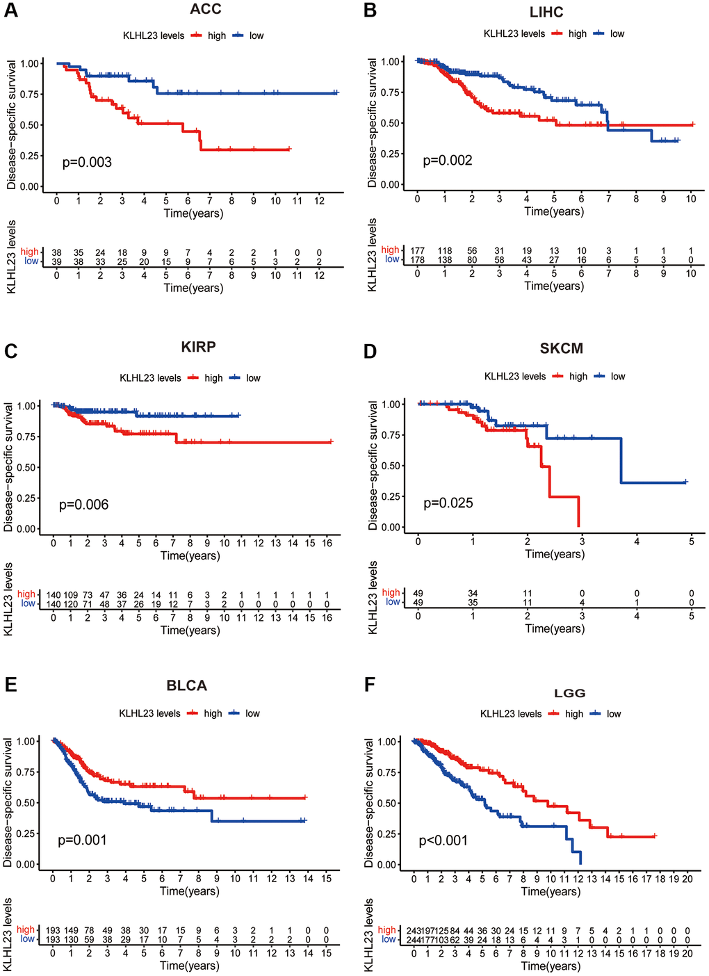 Further analysis was conducted to examine the prognostic significance of KLHL23 expression in various cancer types. Our results showed that high expression of KLHL23 was associated with a poor prognosis in patients with liver cancer (LIHC, P = 0.002), adrenocortical carcinoma (ACC, P = 0.003), Kidney renal papillary cell carcinoma (KIRP, P = 0.006), and skin cutaneous melanoma (SKCM, P = 0.025) (Figure 3A–3D). Meanwhile, low expression of KLHL23 was an indication of poor prognosis in patients with BLCA (P = 0.001) and LCG (P < 0.001) (Figure 3E, 3F).