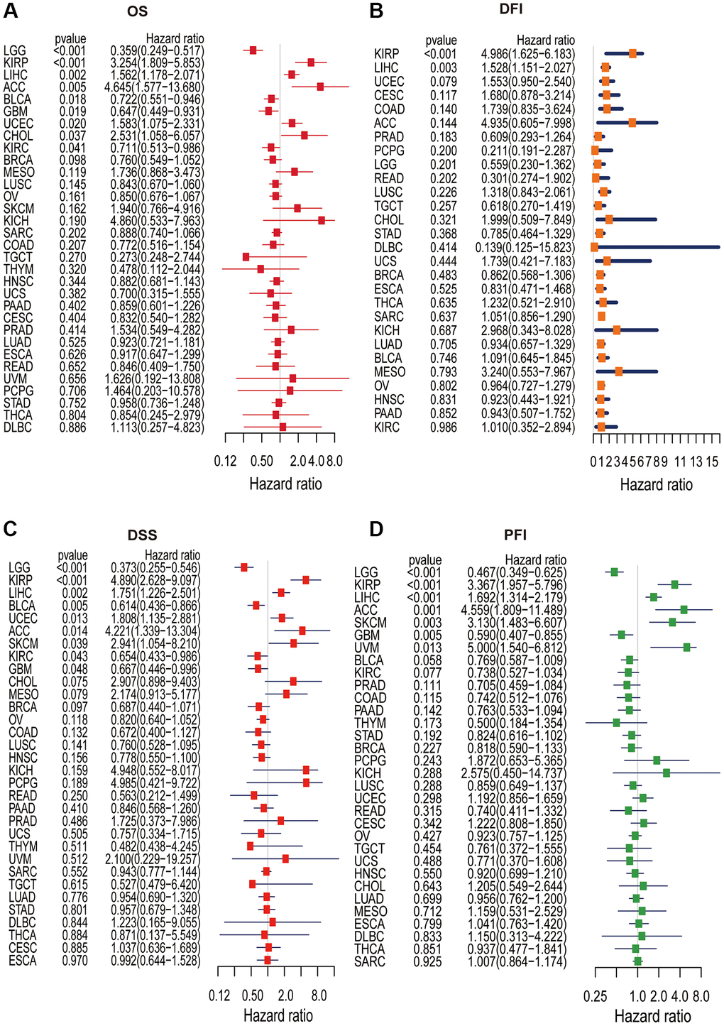 Single-variate Cox regression analysis was performed to examine the relationship between KLHL23 expression levels and OS, DFI, DSS, and PFI in different cancer types. High KLHL23 expression was found to be a risk factor for OS, DSS, and PFI in many cancer types (Figure 4A–4D). Based on the analysis of OS, elevated KLHL23 expression was identified as a risk factor for KIRP (P < 0.001), LIHC (P = 0.002), ACC (P = 0.005), UCEC (P = 0.020), and CHOL (P = 0.037). In contrast, lower expression of KLHL23 was associated better overall survival prognosis in LGG (P < 0.001), BLCA (P = 0.018), GBM (P = 0.019), and KIRC (P = 0.041).