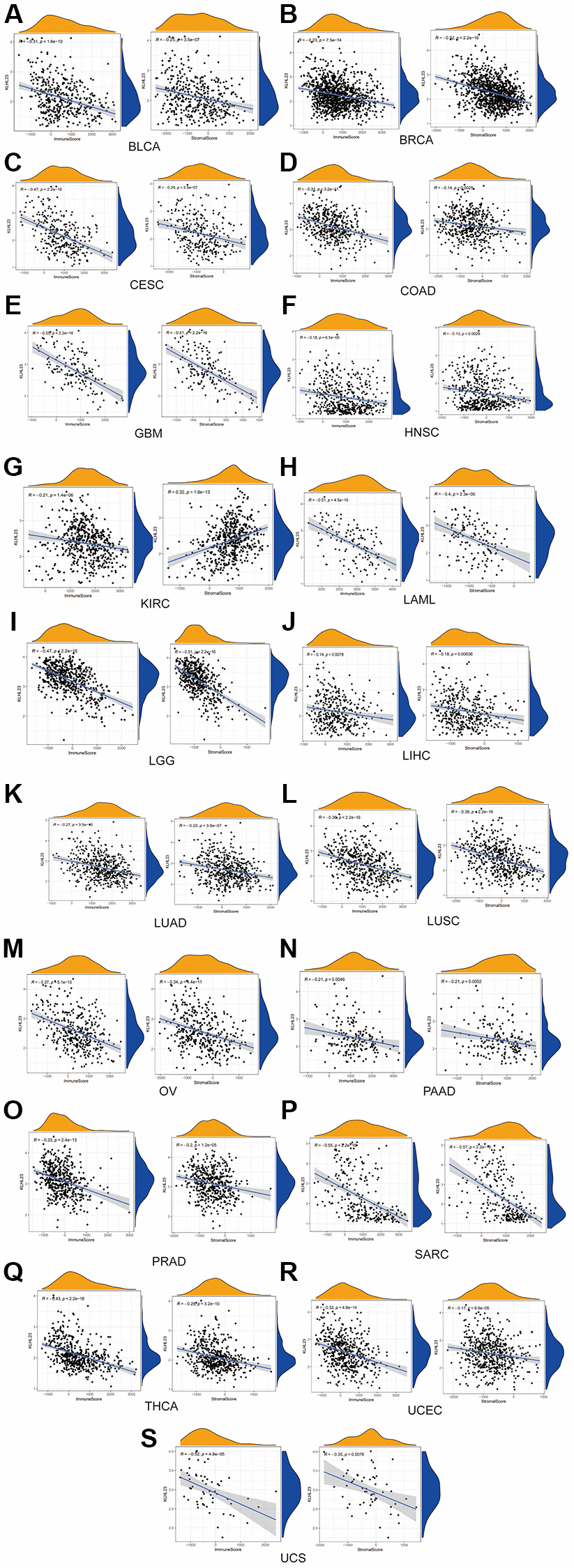 In our study, a negative association was observed between KLHL23 expression and these scores. Our results suggest that higher levels of KLHL23 expression were linked to reduced immune and stromal cell infiltration within the tumor (Figure 5A–5S). The observed negative correlation between KLHL23 expression and immune/stromal cell infiltration scores highlights the possible involvement of KLHL23 in regulating the tumor microenvironment. The negative correlation between KLHL23 expression and immune/stromal cell infiltration suggests that increased KLHL23 levels could be associated with a less active immune environment within the tumor, which may have implications for the effectiveness of immunotherapy and other treatments relying on the body’s immune response to combat cancer cells. Furthermore, this association highlights the potential role of KLHL23 in modulating the tumor microenvironment and could provide insights into the mechanisms underlying tumor progression and metastasis.