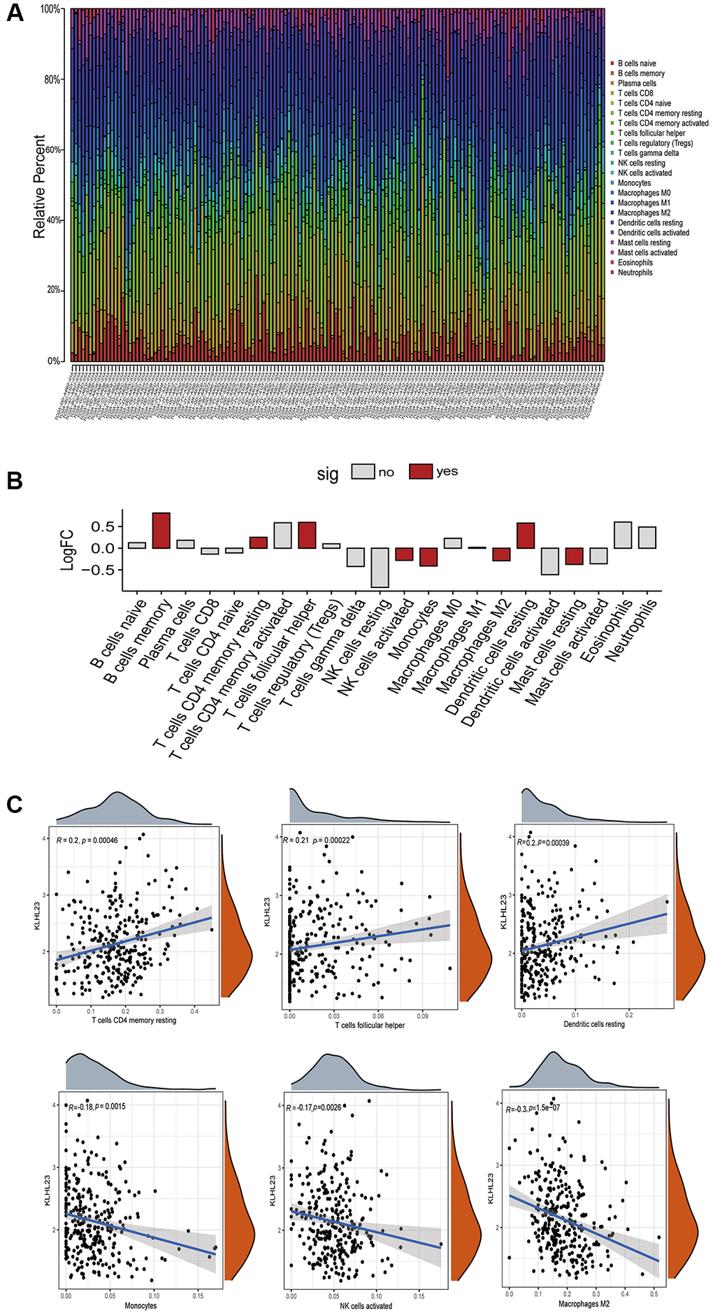 The CIBERSORT method was used to determine the distribution pattern of immune cells with high and low KLHL23 expression in each patient sample (Figure 6A and Supplementary Figure 1). In addition, we examined immune cell infiltration and the relationship between each immune cell type and KLHL23 expression. Elevated levels of KLHL23 expression were significantly associated with reduced counts of immune cells in LIHC (Figure 6B, 6C). Higher KLHL23 expression showed a positive correlation with immune cells such as CD4 memory T cells, T follicular helper cells and resting dendritic cells. Conversely, higher KLHL23 expression was negatively correlated with tumor-infiltrating lymphocytes (TILs), including monocytes, activated natural killer (NK) cells, and M2 macrophages. These findings suggest a potential intricate involvement of KLHL23 in the regulation of these key immune cells within the tumor microenvironment.