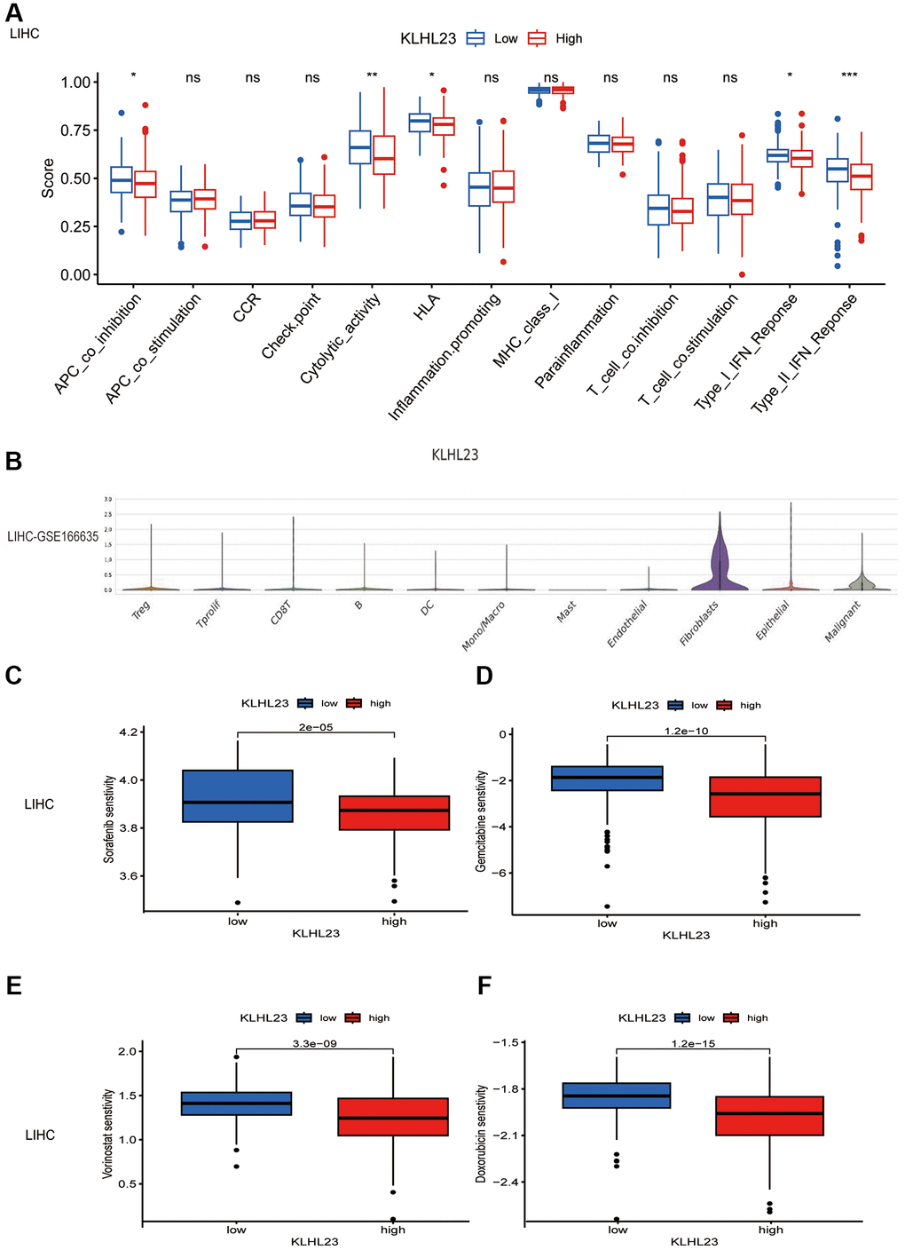Furthermore, we evaluated the sensitivity of potential drugs in relation to KLHL23 expression levels in LIHC using the pRRophetic package (Figure 7C–7F). Our study demonstrated that reduced KLHL23 expression was associated with increased responsiveness to chemotherapy drugs such as sorafenib, gemcitabine, vorinostat, and doxorubicin, which are commonly used in LIHC treatment. This suggests a potential role for KLHL23 in determining drug sensitivity in LIHC therapy. However, these findings are based on in silico data analysis and require further validation through experimental studies and clinical trials.