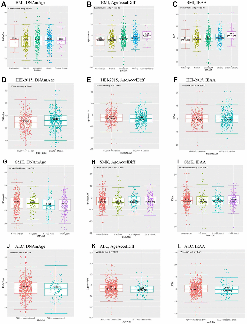 Analyses of alcohol intake and smoking showed the opposite patterns (Tables 1, 2 and Supplementary Table 1 and Figure 2). Compared with never smokers and moderate alcohol users (≤ 14 g/day in women), regular smokers for ≥ 5 years and > 14-g alcohol users had a 1.5-year-younger DNAm age and about a 1-year age decel in AgeAccelDiff, respectively. In addition, women with a higher score on the HEI-2015 scale, indicating better eating behaviors, had an older DNAm age than their counterparts, but they showed an age decel pattern in AgeAccelDiff. However, none of these risk factors substantially influenced epigenetic aging in the BC group.