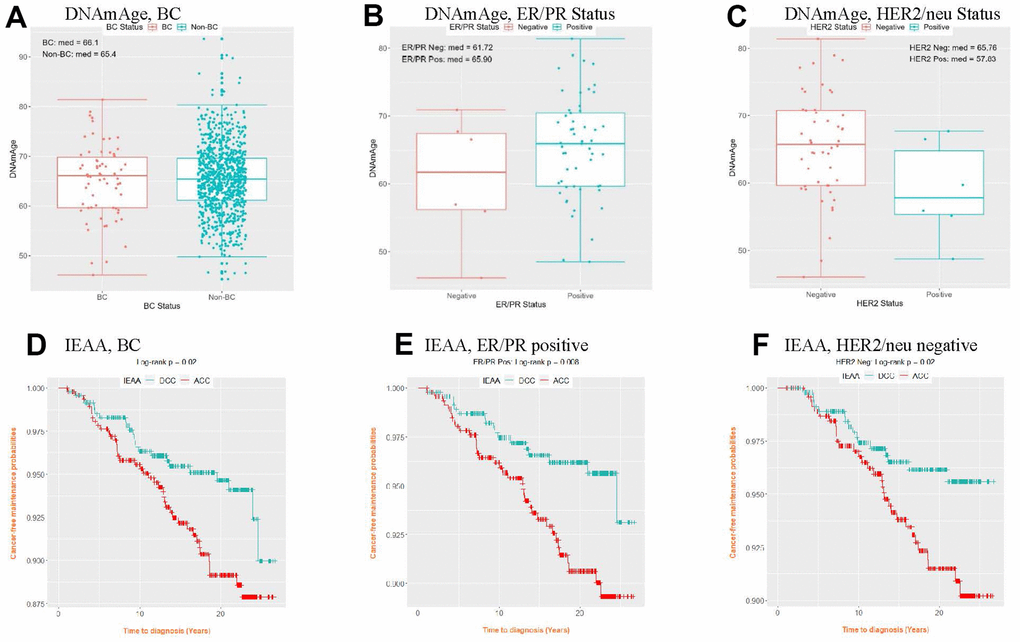 | AgeAccelDiff, epigenetic age acceleration measured as departure of DNAmAge from chronologic age; BC, breast cancer; CI, confidence interval; DNAmAge, DNA methylation–based marker of aging; HR, hazard ratio; IEAA, intrinsic epigenetic age acceleration as residuals by regressing DNAmAge on chronologic age, adjusted for cell composition. Numbers in bold face are statistically significant. | |||||||||||||||||||||||||||||||||||||||||||||||||||||||||||||||||||||||||||||||||||||||||||||||||||