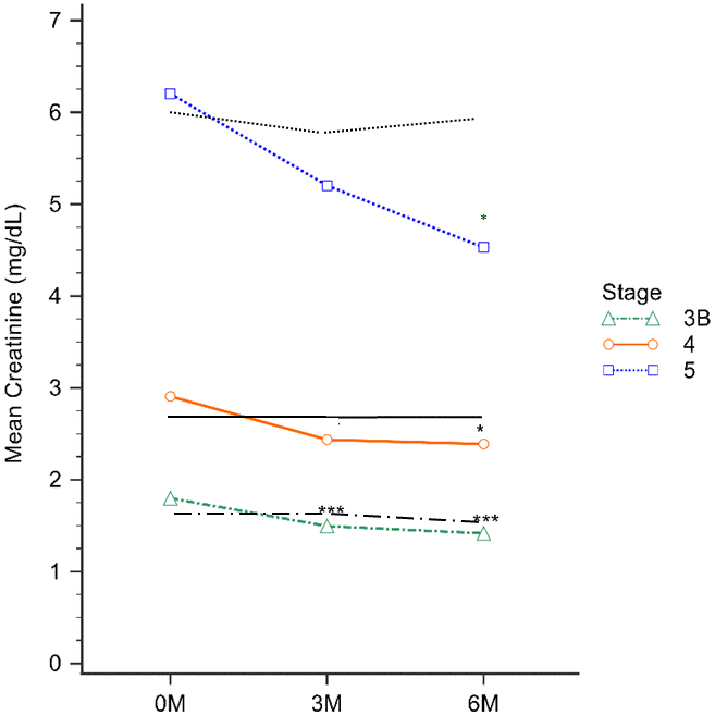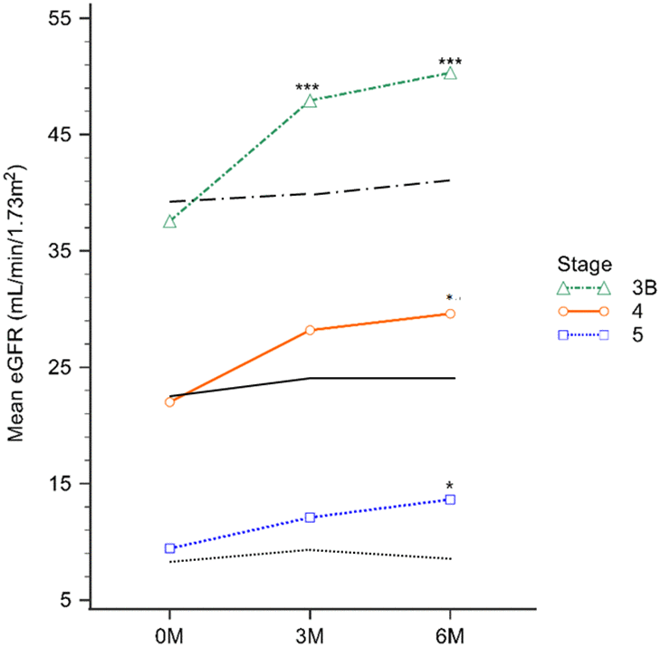 The baseline, 3-month, and 6-month eGFR levels for the EFT study group were 27.31±11.70, 35.06±16.88, and 36.62±16.07 mL/min/1.73 m2, respectively. Notably, in stage 3B, a significant increase in eGFR was observed at both the 3-month and 6-month marks during the EFT treatment, compared to controls (all p<0.001). Furthermore, there was a significant improvement in GFR at 6 months for both the Stage 4 CKD and Stage 5 CKD groups (P=0.02 and P=0.01, respectively; Table 3). The EFT study group displayed Cr levels of 2.96±1.86, 2.48±1.59, and 2.22±1.33 mg/dL at baseline, 3-month, and 6-month treatment, respectively. However, a noteworthy decrease in Cr levels was observed in stage 3B at both the 3-month and 6-month EFT treatment intervals compared to controls (P<0.01 and P<0.001, respectively). Similarly, the stage 4 CKD and stage 5 CKD groups exhibited a significant decrease in Cr levels up to 6 months of EFT treatment (P=0.04 and P=0.03, respectively) (Table 3).