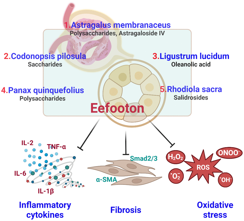Conventional interventions, including RAS blockers and SGLT2 inhibitors, aim to delay CKD progression [13–15]. However, using ACEIs or ARBs in older individuals and severe CKD is restricted due to potential risks like hyperkalemia and acute kidney injury [16]. The efficacy of traditional medical treatments for CKD is presently constrained, prompting an increasing interest in investigating complementary and alternative medicine (CAM) for the management of CKD [17]. Traditional Chinese medicine (TCM) is an economical and widely adopted complementary and alternative medicine (CAM) with a long history, especially prevalent in Asia. Numerous clinical studies have shown that TCM effectively manages early-stage CKD, leading to a significant decrease in the risk of progressing to end-stage renal disease (ESRD) [18–20]. Notably, the herbal formula Eefooton (EFT), part of TCM, has shown efficacy in slowing CKD progression. Comprising herbal extracts like Astragalus membranaceus (A. membranaceus) and Rhodiola sacra (R. sacra), EFT demonstrates varied biological effects, including immunomodulatory properties, anti-oxidative stress, anti-inflammatory, and anti-fibrosis [21–23]. This study aims to clarify the clinical effects of EFT in individuals with CKD and includes a literature review on the potential positive effects of its components.