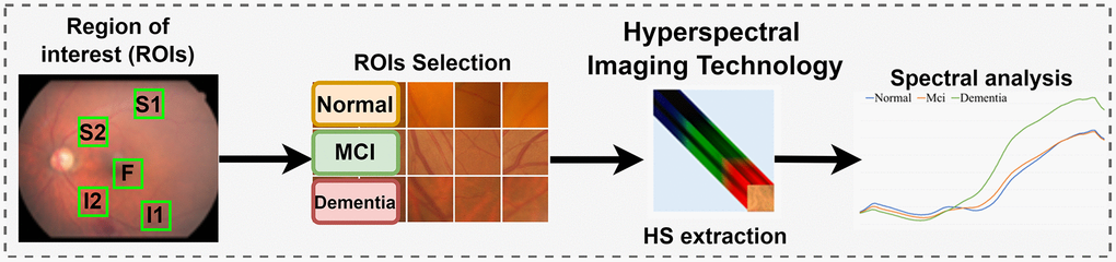 Figure 1 illustrates the comprehensive research process conducted in this study. The research employed hyperspectral imaging technology to capture the spectrum of a specific area within the image and analyze the spectral differences between lesions. Additionally, hyperspectral imaging technology was utilized to extract features from five ROIs within an augmented dataset. Spectral analysis was then applied to the ROIs to facilitate preliminary classification based on the MMSE. The collected ophthalmoscopic images were sampled in specific areas. The regions are selected to ensure correlation between spectral variables and to avoid selection bias. Sampling areas with high color contrast representation because of the presence of vascular organizations, and biological organs of the eye such as fovea and nerve fiber, help to enhance spectra bands [28]. The sampling locations were set in five positions: above the temporal vascular arcade (S1 and S2), the fovea (F), and below the temporal vascular arcade (I1 and I2). The area size was 240 × 240 pixels. The images were then transformed into 401 bands of visible-light spectrum information using hyperspectral conversion technology. HS imaging algorithm for ophthalmoscopic images is described in our previous studies [6, 36]. The resulting spectral information contained 401 spectral channels within the visible-light band (380 nm to 780 nm). The five positions, S1, S2, F, I1, and I2, are obtained as hyperspectral signals. The spectral intensity is calculated as the mean value in each region (the mean value following the spatial dimension 240 × 240) and then represented on the corresponding diagrams. The stages of dementia, including normal, MCI, and dementia, are detected by analyzing the differences in spectral intensity on the diagram.