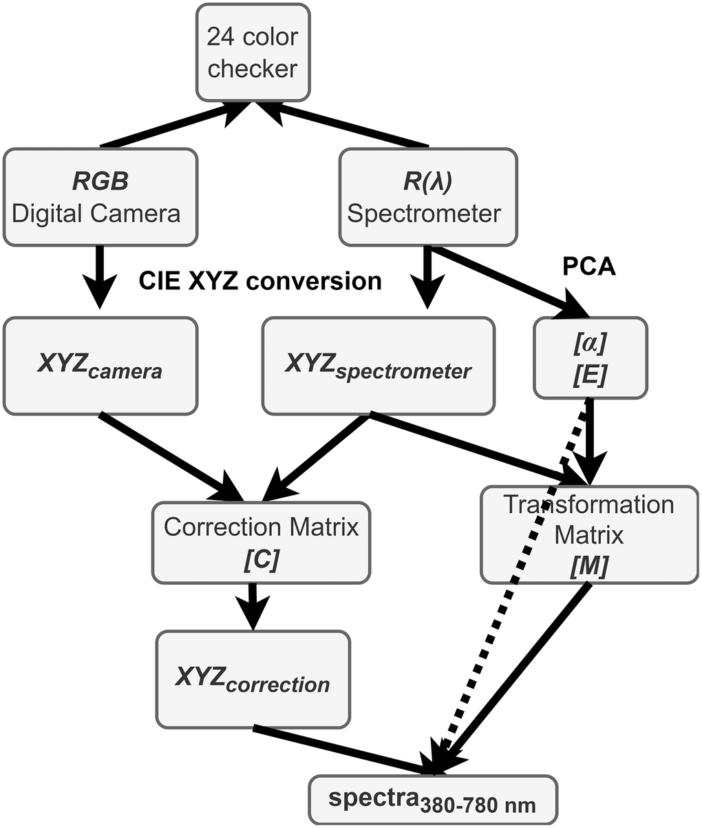 Eventually, a transformation matrix (M) among the camera and spectrophotometer was determined by the following equation: