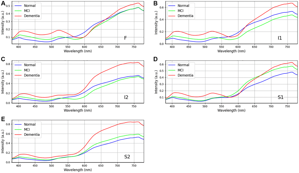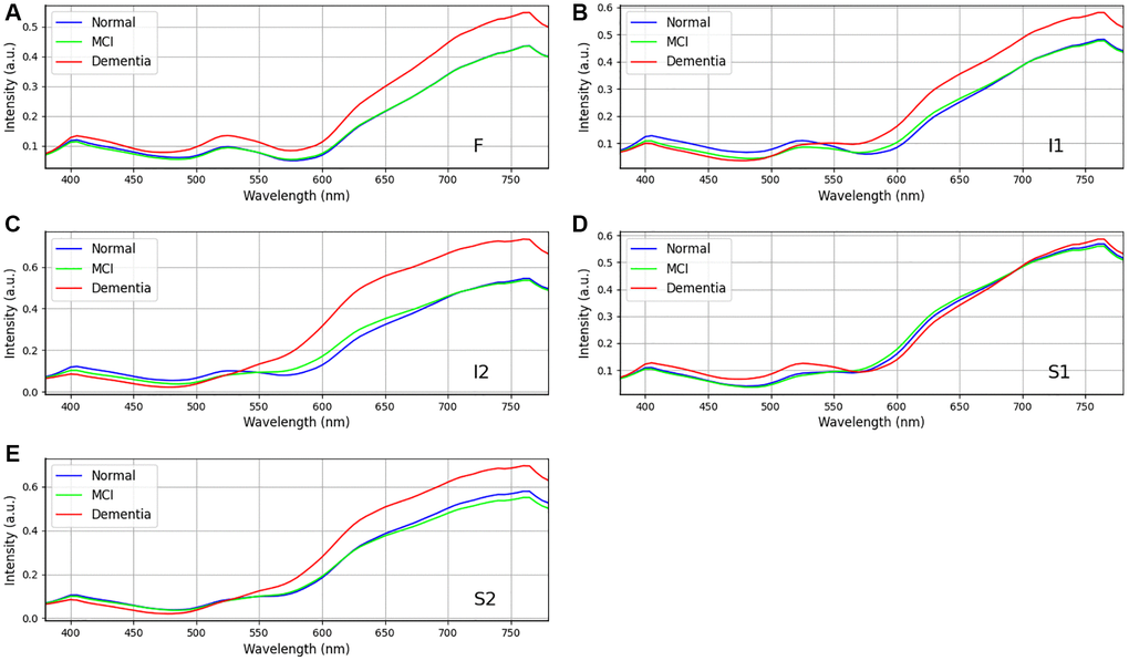 Statistical analysis was performed to examine the influence of gender on different levels of dementia on dataset in Table 2. The chi-square statistic is a measure of the overall association between gender and class in the observed contingency table. In this case, the chi-square statistic is 0.778, indicating a relatively low value. A larger chi-square statistic suggests a stronger association between the variables. The p-value associated with the chi-square statistic measures the probability of obtaining the observed association (or more extreme) between gender and class by chance alone, assuming that there is no true association in the population. In this case, the p-value is 0.678, which is greater than the typical significance level of 0.05. There is no significant difference in the distribution of genders among the three classes. Cramer’s V is an effect size measure for the chi-square test. It quantifies the strength of the association between gender and class, ranging from 0 to 1. A value closer to 0 indicates a weaker association, while a value closer to 1 indicates a stronger association. In this case, Cramer’s V is 0.075, suggesting a weak association between gender and class. Figures 4 and 5 show the retinal spectra of patients with different degrees of dementia for women and men of the same age, respectively. The results revealed that, in the area S1, no discernible spectral difference was observed. Furthermore, the variations among the three stages in the regions of F, I1, I2, and S2 were also found to be statistically insignificant within the wavelength range of 380 nm to 600 nm. However, when the wavelength was between 600 nm to 780 nm, the spectral reflection intensity of dementia was significantly higher than that of MCI and normal categories. This trend was consistent for women and men. The spectral reflection intensity of dementia was higher than those of MCI and normal conditions at the wavelengths of 380 nm to 600 nm in all five regions. However, the spectral reflection intensity of normal condition was higher than those of dementia and MCI at wave-lengths of 600 nm to 780 nm.