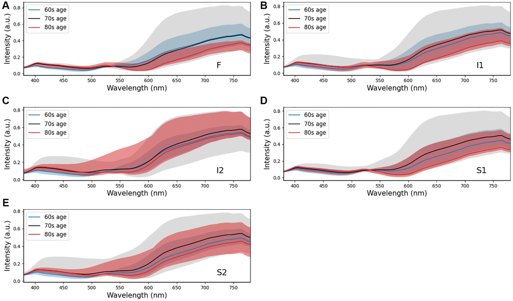 The observed variations in longer wavelengths among the three different age groups can be attributed to the differential presence of Aβ plaques and oligomers. The profiles shown in Figure 6 demonstrate an increase in the difference of reflectance at longer wavelengths at five surveyed locations. This rough surface profile contributes to a scatter phenomenon when observed using hyperspectral imaging. The most pronounced difference is observed at the foveal location (F), as well as the superior (S1) and inferior (I1) locations. In our study, we selected three patients from three different age groups (60s, 70s, and 80s). The Chi-square statistical analysis was employed to assess a cohort comprising 137 patients and to scrutinize the spectra derived from 3,000 corresponding ophthalmoscope images. The resulting p-value, at 0.032, attests to statistical significance, thereby indicating that age may be considered a contributory factor in the etiology of dementia.