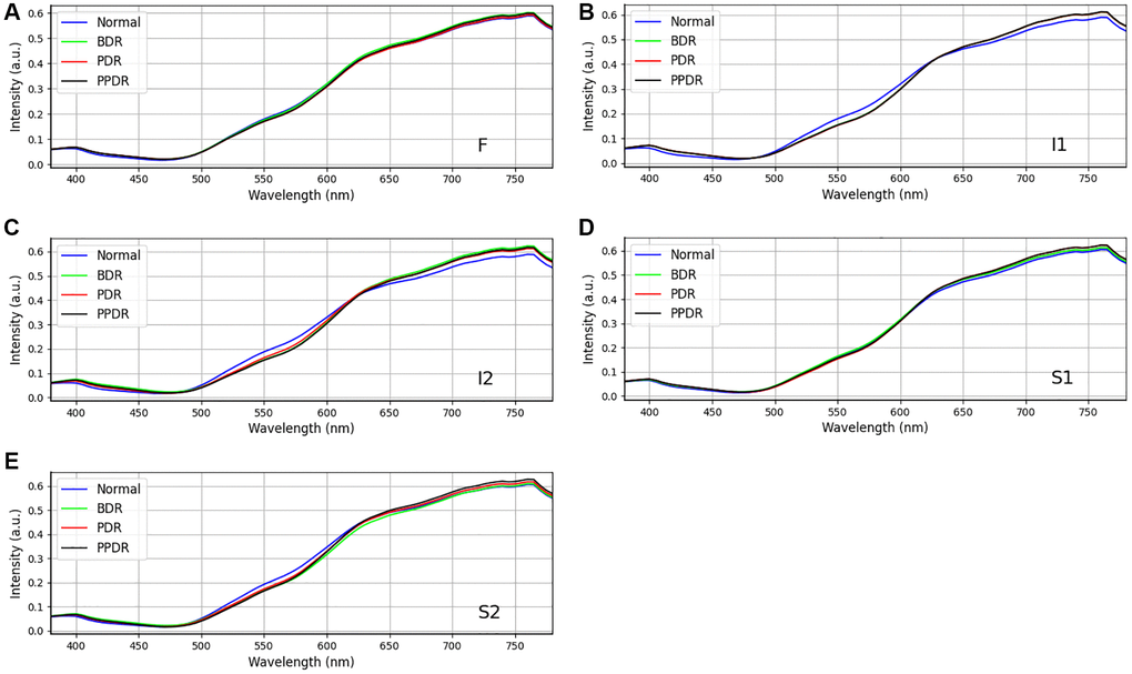 The relationship between dementia and diabetes has received limited attention in previous research. An investigation into the progression of diabetic retinopathy (DR) from mild to moderate and severe stages has proposed a potential link between diabetes and the development of dementia. However, it is crucial to acknowledge that these conclusions stem from clinical trials with a relatively small sample size. In an effort to mitigate potential analytical biases associated with diabetes, this study conducted an additional analysis of a spectrum of diabetic ophthalmoscopy images. The analysis primarily focused on assessing the oxygen concentration in the blood vessels of the retina in patients with diabetes as the basis for staging. The diabetic ophthalmoscopy image spectrum was categorized into four stages: Normal, background retinopathy (BDR), preproliferative retinopathy (PDR), and proliferative retinopathy (PPDR). In Figure 7, it is evident that the spectral regions show no substantial differences across the four stages of diabetes. This observation suggests that the various stages of diabetes predominantly impact the vascular system, encompassing both the arteries and veins within the eye. Conversely, the structural abnormalities associated with dementia are relatively minor in scale and are typically confined to the retina, often presenting with minimal external manifestations. The p-value obtained from the Chi-square statistical analysis of 137 samples from Table 2 (p-value = 0.006) and more than 3,000 ophthalmoscope images (p-value < 0.05) suggests sufficient statistical significance to support the conclusion that there are no significant influences of diabetes on dementia within the scope of this study.