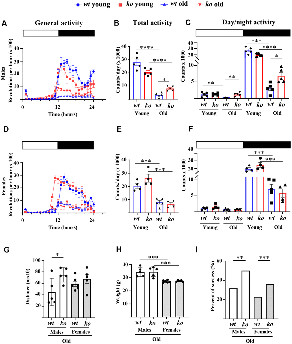 The daily voluntary physical activities as analyzed by wheel running experiments during 24 hours (Figure 1A) are significantly reduced in old wt male mice as compared to the young wt male animals (Figure 1A, 1B). The age-associated decline in voluntary activities occurs in both inactive phase (daytime) and active phase (nighttime period) but mainly in the latter phase (Figure 1C). Interestingly, arg-ii gene deficiency (arg-ii-/-) reduced the age-associated decline of voluntary activities during the inactive phase and significantly improved that during the active phase (Figure 1C). Similar to the males, an age-associated decline in voluntary activities was observed in females (Figure 1D). However, no difference in the activities were observed between old wt and age-matched arg-ii-/- females either during the daytime or the nighttime (Figure 1D–1F). Furthermore, a non-voluntary muscle strength test, i.e., treadmill test, demonstrated a significant improvement in running distance in the old arg-ii-/- male mice as compared to the age-matched wt controls (Figure 1G), while this improvement of physical activities was not observed in old female group (Figure 1G). Of note, the body weight in the male group was significantly higher than the female group but was not significantly different within each sex group between wt and arg-ii-/- mice (Figure 1H). The traction test, however, showed an enhanced success rate in the old arg-ii-/- mice as compared to the aged-matched wt animals in both males and females (Figure 1I). Of note, young animals showed a 100% success rate (not shown).