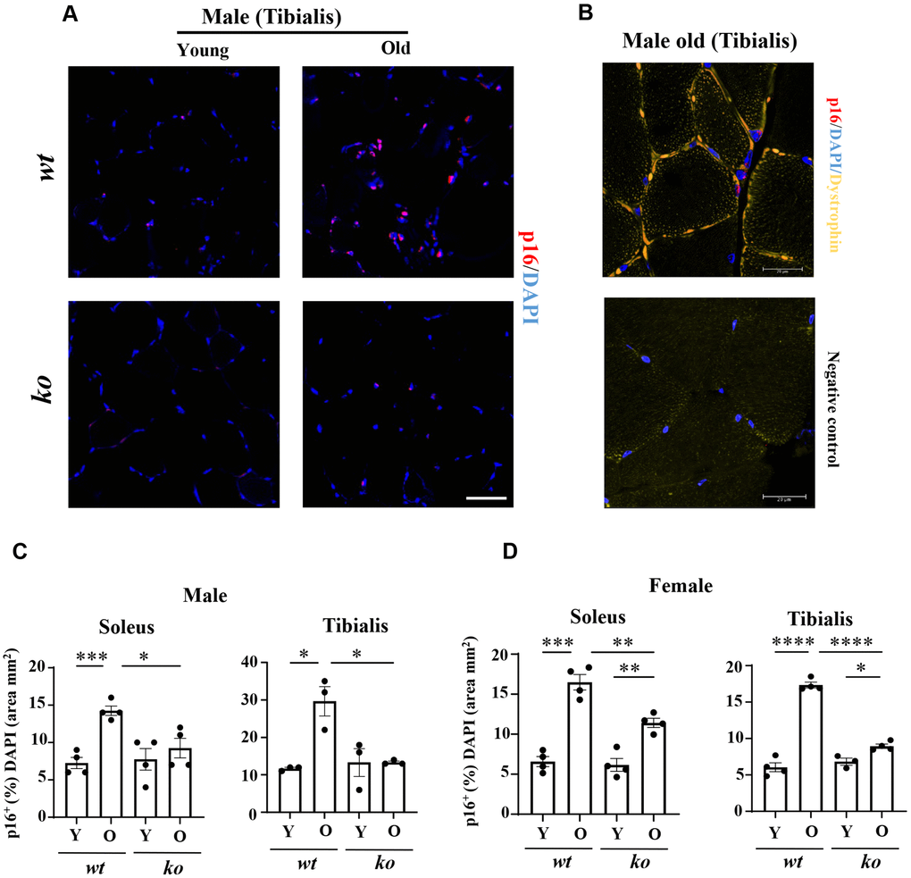 The soleus and tibialis muscles were isolated and analyzed to study the skeletal muscle aging phenotype. In the wt male mice, the myofiber cross-sectional area (CSA) of soleus was significantly decreased with aging (Figure 2A, 2B), which was partly inhibited in the age-matched male arg-ii-/- mice (Figure 2A, 2B). In the tibialis, however, arg-ii deficiency did not significantly affect the age-associated sarcopenia (Figure 2C). The age-associated decrease in CSA was significantly ameliorated in soleus and tibialis of female arg-ii-/- mice (Figure 2D, 2E). Moreover, the number of p16+ (senescent marker) cells (Figure 3A, 3B) was significantly higher in old male wt mice as compared to the young wt animals either in soleus or tibialis, which was decreased in age-matched arg-ii-/- mice (Figure 3C). Similar findings on the inhibitory effects of arg-ii-/- on cell senescence were observed in aged female mouse muscles (Figure 3D). The p16+ nuclei were confirmed to be the skeletal muscle fibers (e.g., in tibialis of the male mice) by performing co-immunostaining of p16 and dystrophin (Figure 3B). Furthermore, a significant age-associated increase in the number of centralized nuclei in soleus of male mice was observed, which was reduced in age-matched arg-ii-/- animals (Figure 4A, 4B). A similar trend of arg-ii-/- inhibitory effect on age-associated increase in centralized nuclei was observed in tibialis. This, however, did not reach statistical significance (Figure 4C). The age-associated increase in centralized nuclei was also significantly decreased in arg-ii-/- female mouse soleus but not in tibialis (Figure 4D, 4E).