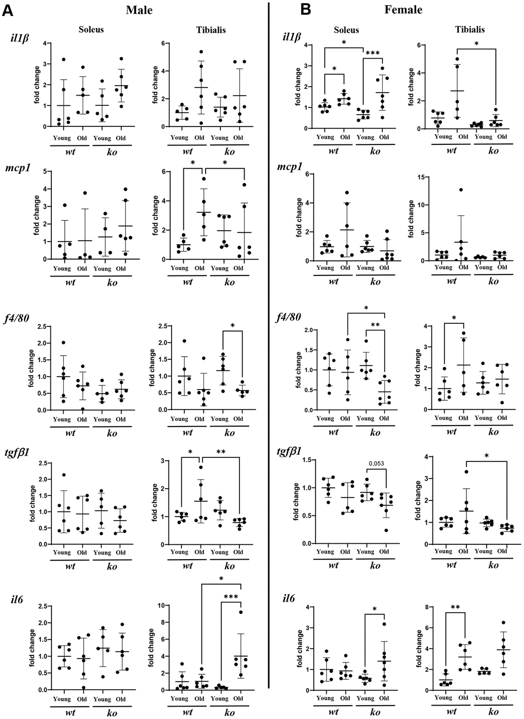 Statistical analyses were performed with GraphPad Prism Software. All data are expressed as mean ± standard error of the mean (SEM). In all the experiments, “n” indicates the number of independent experiments or the number of mice used in each group. The Shapiro-Wilk test (that determines normality when n ≥ 3) was used first to determine whether the data had a normal Gaussian distribution. According to the different types of data, the following statistical analyses are performed. Student’s unpaired t-test with a Welch’s correction was used for parametric analyses. Mann–Whitney t-tests were used for non-parametric analyses. To analyze the difference between the means of more than two groups normally distributed, an analysis of variance (ANOVA) was performed followed by multiple comparisons with uncorrected Fisher’s least significant difference (LSD) test. If data were not normally distributed, The Kruskal–Wallis test was then applied. For qPCR analysis, each value has been rationalized on the average value of wt young groups, giving an “average fold change” value.