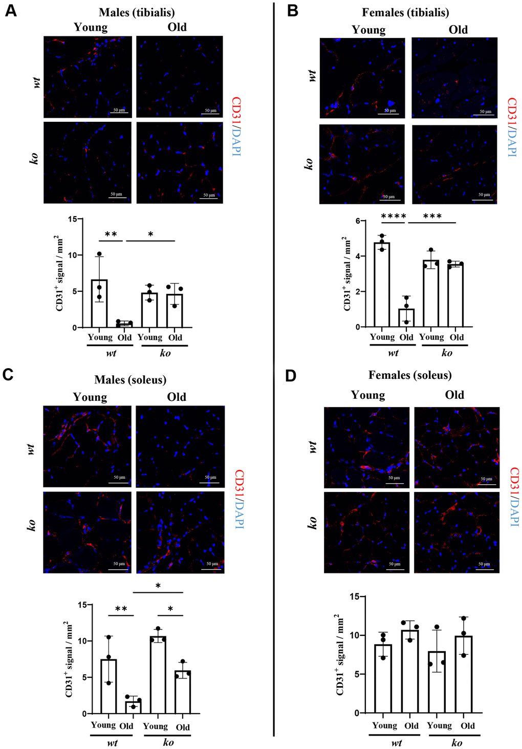 Since age is associated with chronic inflammation, the role of arg-ii in skeletal muscle inflammation was analyzed in soleus and tibialis of old wt and arg-ii-/- mice. Gene analysis of several inflammatory cytokines in the skeletal muscle tissues from male mice revealed that there was a significant reduction of mcp1 (male) and tgfb1 in the tibialis (not soleus) in arg-ii-/- as compared to age-matched wt animals (Figure 5A). No consistent inhibitory effect of arg-ii-/- on other inflammatory markers such as Il-1b, f4/80, Il6 was observed (Figure 5A). In the female mice, arg-ii-/- reduced Il-1b, mcp1, f4/80, tgfb1 in either one or two skeletal muscles (Figure 5B). Immunofluorescence confocal staining confirmed the age-associated increase in F4/80+ cells (macrophages) in tibialis of male mice, which was reduced in age-matched arg-ii-/- animals (Supplementary Figure 1). Importantly, an age-associated decrease in CD31+ cells (an endothelial marker) was observed in tibialis and soleus of wt male mice, which was prevented in age-matched arg-ii-/- animals (Figure 6A, 6C). This preventive effect of arg-ii-/- was also observed in the female tibialis muscle (Figure 6B). However, no age-associated decrease in CD31+ signals and no significant effects of arg-ii-/- were observed in the female soleus (Figure 6D).