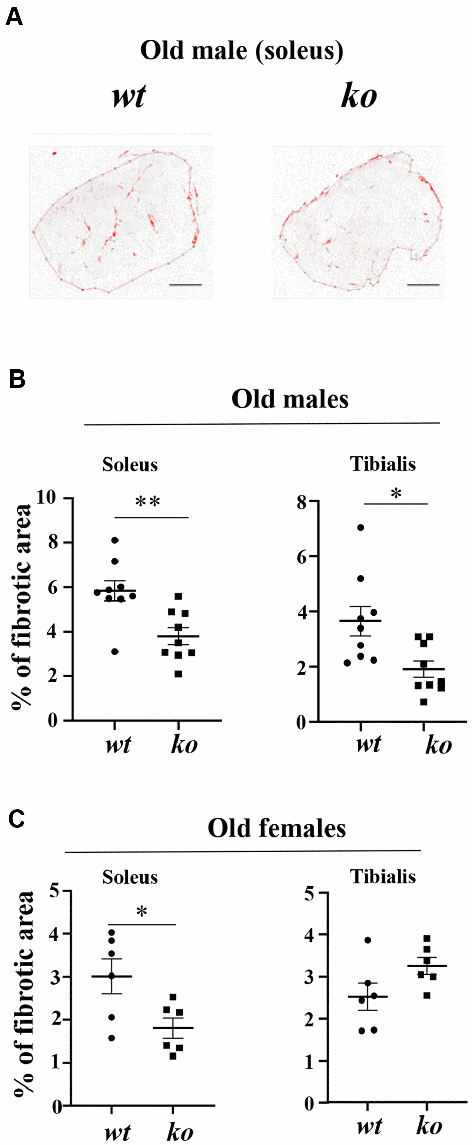 Age-associated skeletal muscle fibrosis, although mild, was observed in the soleus and tibialis of male wt mice, which was reduced in age-matched arg-ii-/- animals (Figure 7A, 7B). Similar results on inhibition of skeletal muscle fibrosis in arg-ii-/- mice were demonstrated in the female mouse soleus but not in the tibialis (Figure 7C), demonstrating partial prevention of age-associated muscle fibrosis by arg-ii deficiency. No effects of arg-ii deficiency on the expression of col1α1 or col3α1 assessed by qRT-PCR were observed in males or females of old mice (Supplementary Figure 2A, 2B).