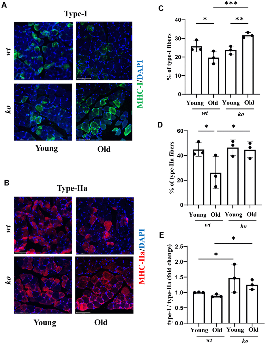 Since the tibialis muscle in mice does not have much type-I and type-IIa [25], which is in contrast to the soleus muscle (Supplementary Figure 3), the muscle fiber types were therefore analyzed in the soleus. As shown in Figure 8A–8D, there was an age-associated decrease in both type-I and type-IIa fibers in the soleus muscle of male mice, which was prevented in age-matched arg-ii-/- animals. A similar finding was observed in female soleus for type-I (Supplementary Figure 4A, 4C), but not type-IIa fibers (Supplementary Figure 4B, 4D). Of note, the portion of type IIa fibers in female soleus was very low (Supplementary Figure 4B) and the type-I/type-IIa ratio was much higher in females than males of both wt and arg-ii-/- animals (Supplementary Figure 5). Interestingly, the ratio of muscle fiber type-I/type-IIa was not significantly affected by aging (Figure 8E). However, arg-ii-/- significantly enhanced type-I/Type-IIa ratio in males (Figure 8E), but not in females (Supplementary Figures 4E and 5).