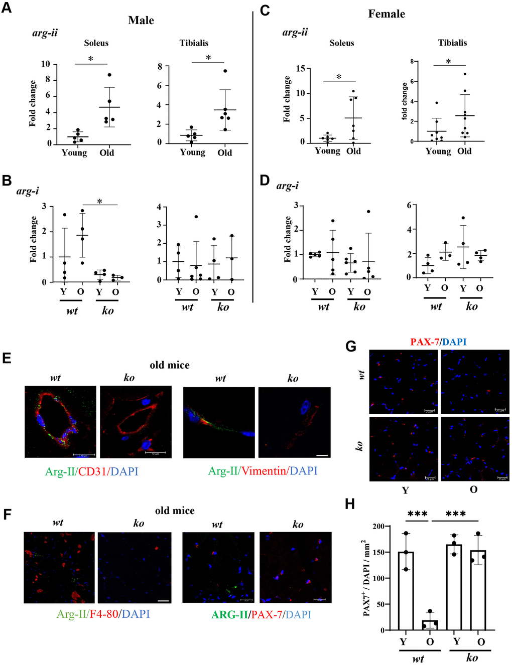 In soleus and tibialis of both males and females, arg-ii expression levels detected by qRT-PCR are significantly increased in aging (Figure 9A, 9C), while no significant changes in arg-i were observed with aging (Figure 9B, 9D) and no significant effects of arg-ii-/- on arg-i expression were found in male and female animals, except a decrease in arg-i expression in the old arg-ii-/- male soleus as compared to age-matched wt animals (Figure 9B). However, immunoblotting was unable to demonstrate Arg-II protein signals (data not shown), suggesting low expression levels of Arg-II in the skeletal muscle. Therefore, confocal immunofluorescence staining was performed for cellular localization of Arg-II in the skeletal muscle of aged animals. Arg-II was not found in skeletal muscle fibers, which was, to our surprise. Arg-II was however found in CD31+ endothelial cells and vimentin+ fibroblasts (Figure 9E). Arg-II was not found in the F4/80+ macrophages in the skeletal muscle of aged mice (Figure 9F). It is also not found in Pax7+ satellite cells (Figure 9F). Interestingly, Pax7+ satellite cells were decreased in aging wt mice, which was prevented in arg-ii-/- mice (Figure 9G, 9H). Co-immunostaining demonstrated that vimentin+ fibroblasts and F4/80+ macrophages expressed TGFβ-1 (Supplementary Figure 2C), indicating a role of Arg-II in the activation of fibroblasts.