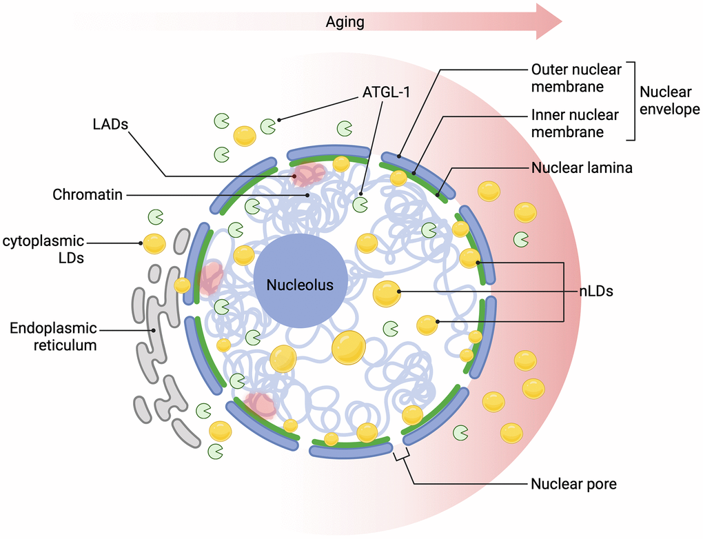 The identification of age-dependent nLDs accumulation as a hallmark of ageing marks a significant advancement in our understanding of the interplay between lipid metabolism and nuclear function. Accumulation of nLDs disrupts nuclear integrity, potentially impairing essential nuclear processes such as chromatin organization, DNA repair, and gene expression. Beyond advancing our knowledge of the ageing process, this discovery suggests promising targets for interventions aimed at extending healthspan and preventing age-related diseases. As research into nLDs regulation progresses, it is conceivable that novel therapeutic strategies will emerge, leveraging lipid metabolism to combat the effects of ageing and enhance human health. Given the established links between lipid deregulation, metabolic disorders, and ageing, these findings hold considerable promise for developing therapies aimed at safeguarding nuclear function and mitigating the adverse effects of ageing on cellular and organismal physiology.