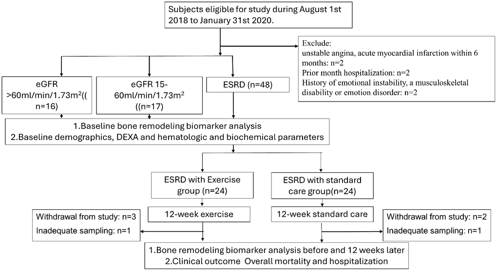 These individuals were recruited via outpatient clinics of nephrology. Participants were provided with informed consent obtained from the trial coordinator. The inclusion criteria were listed as follows: (a) with estimated GFR (eGFR) lower than 60 mL/min/1.73 m2 or spot urine proteinuria (diagnosed as urinary protein to creatinine ratio more than 200 mg/gram), (b) older than 20 years old, and (c) with capability for communication verbally in Mandarin Chinese. The exclusion criteria included: (a) recent acute myocardial infarction or unstable angina a within 6 months prior to enrollment; (b) uncontrolled hypertension (more than 190 mmHg in systolic blood pressure); (c) serum hemoglobin lower than 8 g/dL; (d) with active infection cancer, or autoimmune disease; (e) history of emotional instability, a musculoskeletal disability or emotion disorder; (f) uncontrolled cardiac failure, or respiratory problems; (g) history of hospitalization within 1 month prior to enrollment; (h) known bone diseases (e.g., osteomalacia, Paget’s disease); (i) use medications that affect bone metabolism (e.g., bisphosphonates, glucocorticoids) within the past six months; or (j) pregnant or breastfeeding. Upon enrollment, each participant was categorized into one of four groups: (1) group with eGFR >60 mL/min per 1.73 m2, (2) CKD group with eGFR = 15–60 mL/min per 1.73 m2, (3) an ESRD group receiving an exercise intervention, and (4) an ESRD group with standard care. ESRD was defined as receiving the maintenance hemodialysis (HD) at least more than 3 months continuously. Hemodialysis (HD) was administered three times per week for 3–4 hours each time, with polyether-sulfone used as the dialyzer material.