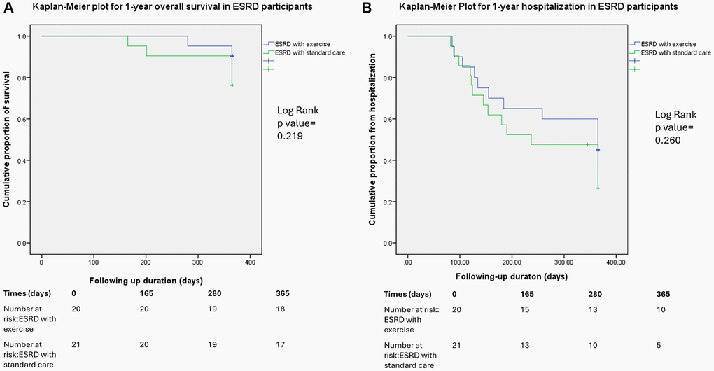 Figure 2 presents a Kaplan–Meier plot comparing the overall survival (panel A) and hospitalization rates (panel B) between the ESRD groups with and without the exercise intervention at the 1-year follow-up. The cumulative rates of hospitalization and overall survival were similar for both groups.